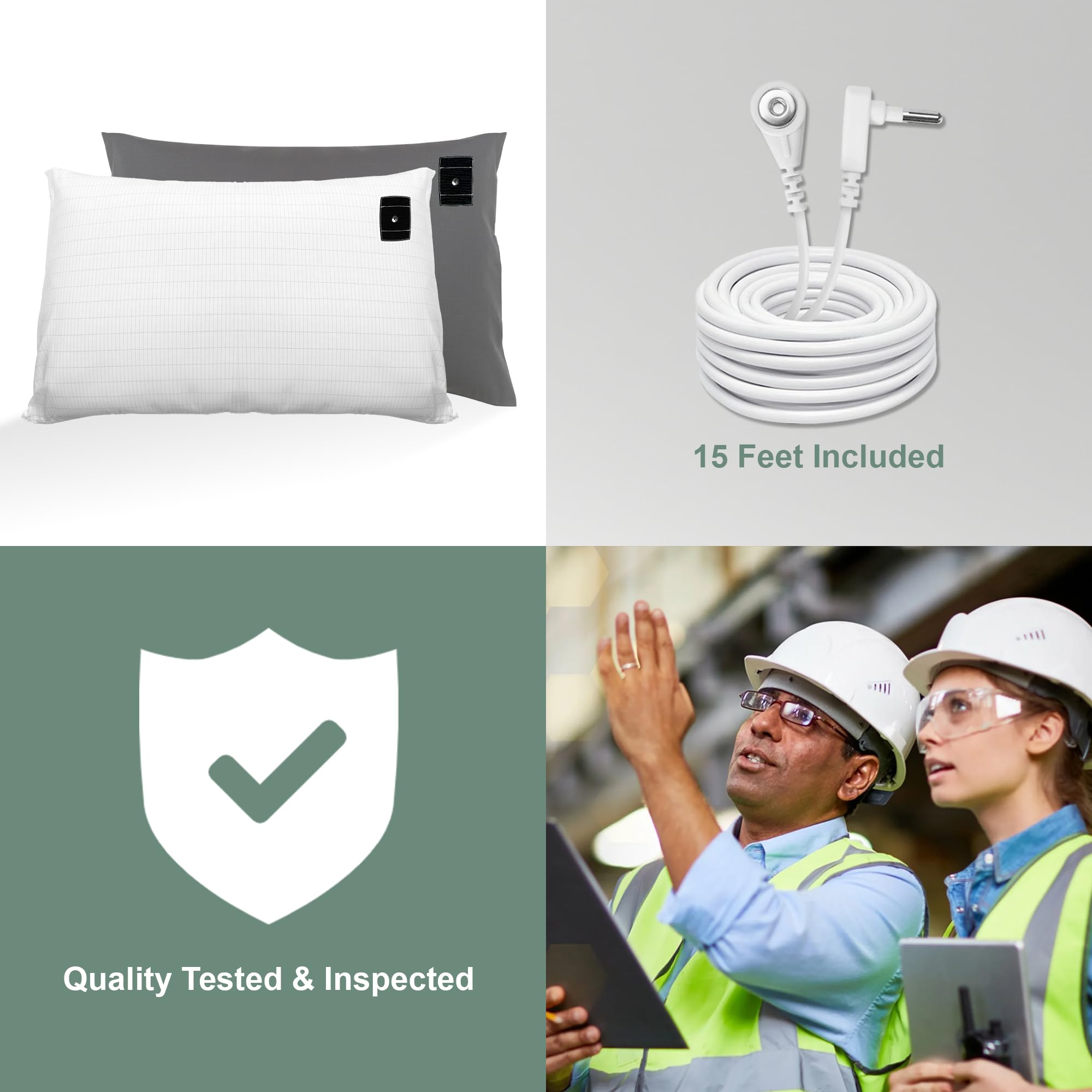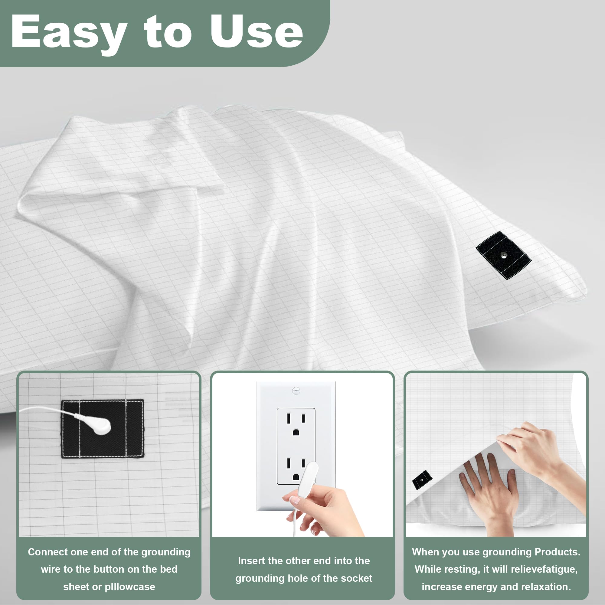 4. Fácil de Usar–Nuestro juego de fundas de almohada conductora para conexión a tierra contiene 2 cables de conexión a tierra que necesita usar al conectar a tierra, y son lo suficientemente largos como para ser fácilmente utilizados en la mayoría de las habitaciones. Solo necesita adjuntar un extremo de esos cables de tierra a las fundas de almohada y enchufar el otro extremo en un enchufe de pared para comenzar.