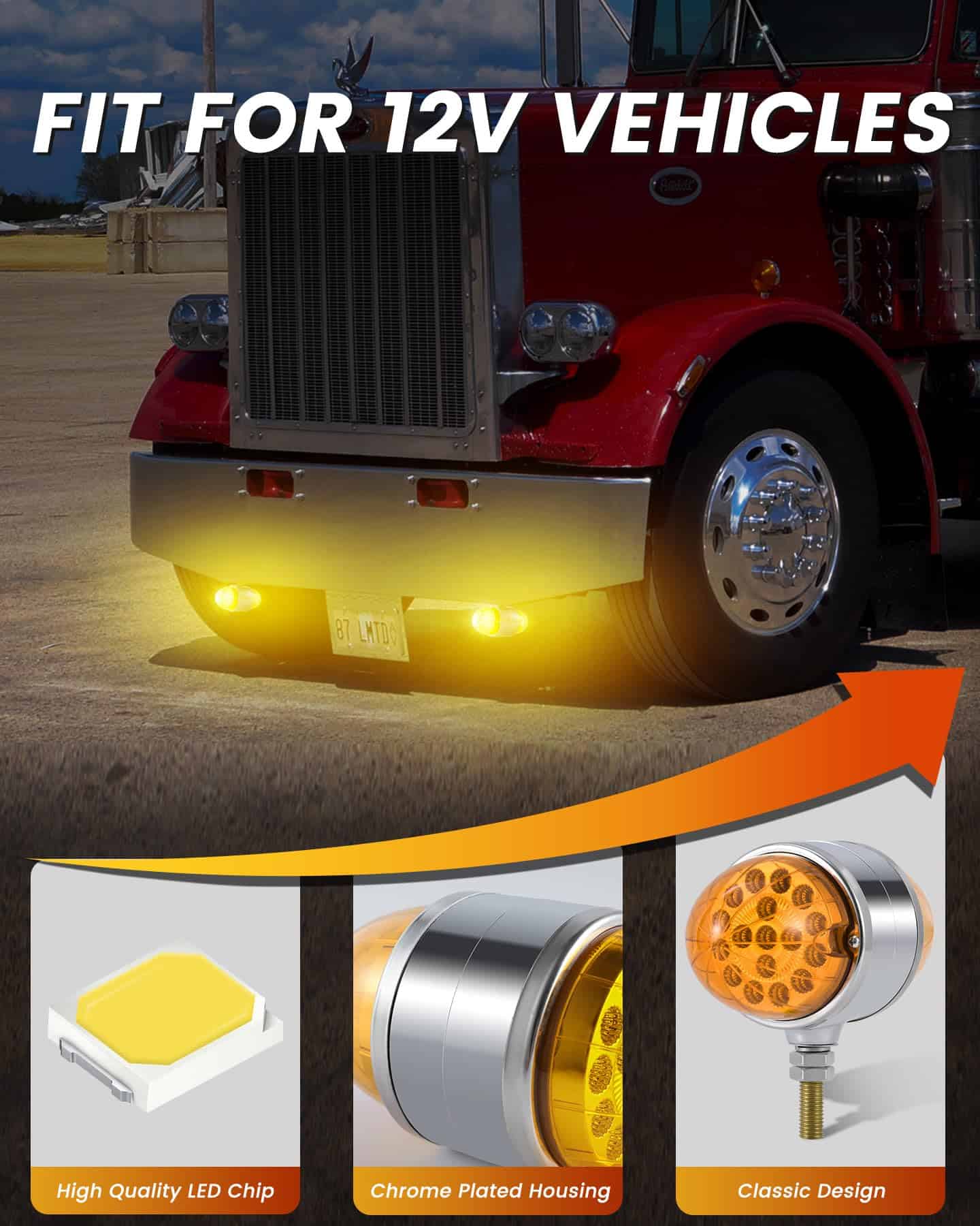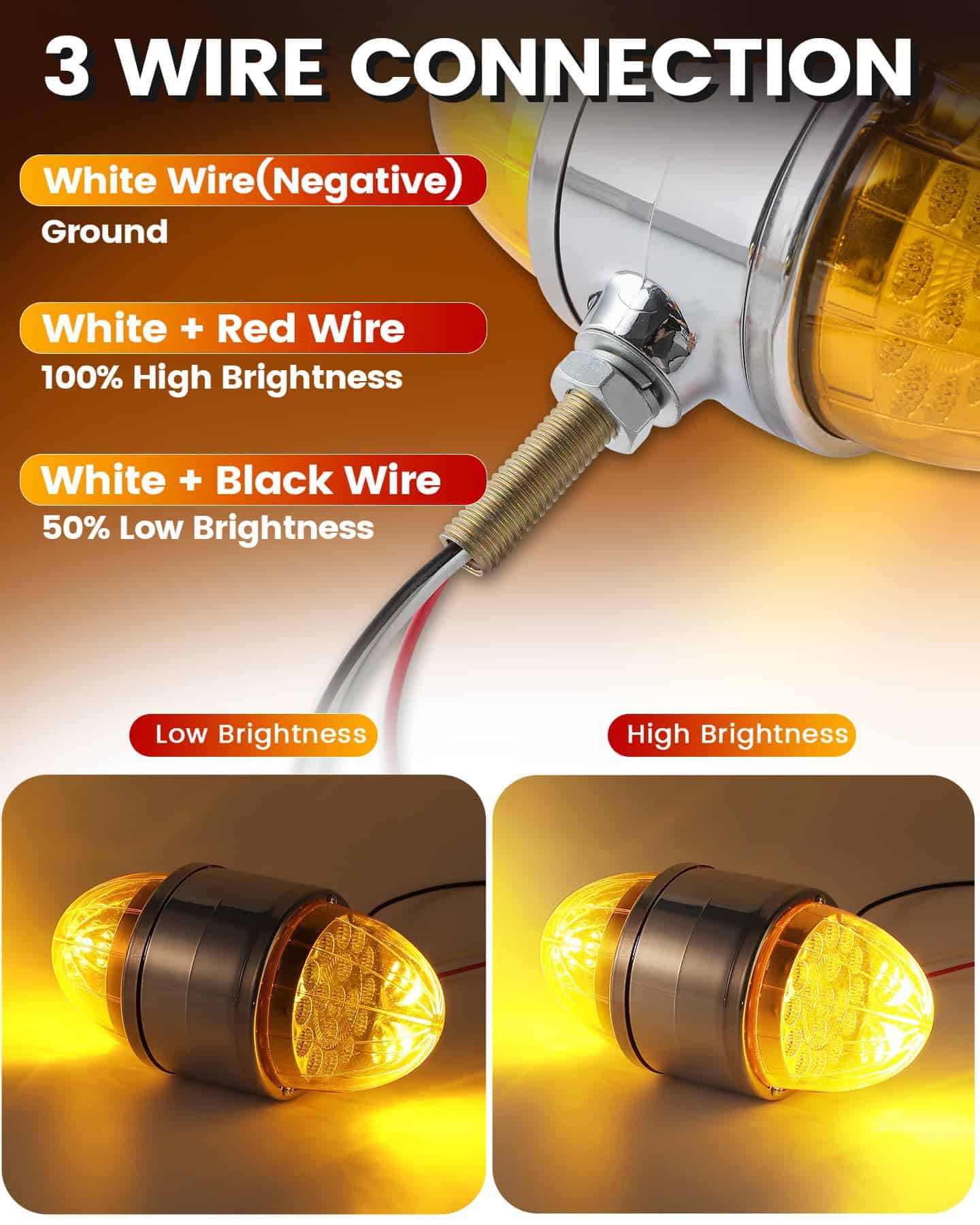 Dimensiones: 106 x 106 x 45mm(4.17″x4.17″x1.77″). Cada luz de LED de doble cara cuenta con 48 LEDs de alta luminosidad (Delantero 24 x LEDs + Trasero 24 x LEDs). Este luminoso fender light de doble cara adopta un diseño de conexión de tres cables que facilita la instalación. El cable negro es tierra (negativo), Negro + Blanco es baja luminosidad, y Negro + Rojo es alta luminosidad. Estas luces de remolque LED de doble cara redondas son luces perfectas para montar en los guardabarros laterales de su camión o remolque, puedes utilizarlas como luces de estacionamiento, luces traseras de señal de giro o luces de freno, luces de señal de giro, luces de marcador lateral, etc. Esta luz de doble camión semi se adapta ampliamente a vehículos de 10-30V, como camiones, remolques, camionetas, RV, autobuses, camiones, furgonetas, caravanas y camiones de carga pesada como Peterbilt, Freightliner, Kenworth, Western Star, International, Mack, etc.