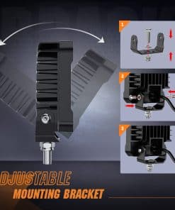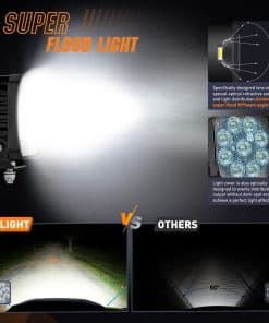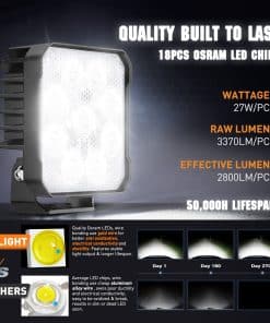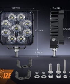 Nilight 4Inch Square Super Flood LED Work Light Pods Especificaciones: Chips LED: chips LED Osram Potencia LED: 27W/PC Lumen Bruto: 3370LM/PC Lumen Efectivo: 2800LM/PC Rendimiento de iluminación: 62 Metros a 1LUX, 10 Metros a 38LUX Tipo de Haz: Haz de Inundación Ángulo de Haz: 90 grados de inundación Voltaje de Operación: 10-30V DC Temperatura de color: 5700K Temperatura de operación: -20 +45 Vida útil: más de 50,000 horas Material: placa de circuito de sustrato de aluminio, chips LED Osram, lente de PC Paquete Incluye: 2PCS 4Inch Square LED Flood Lights 1 Paquete de Soporte de Montaje y Hardware