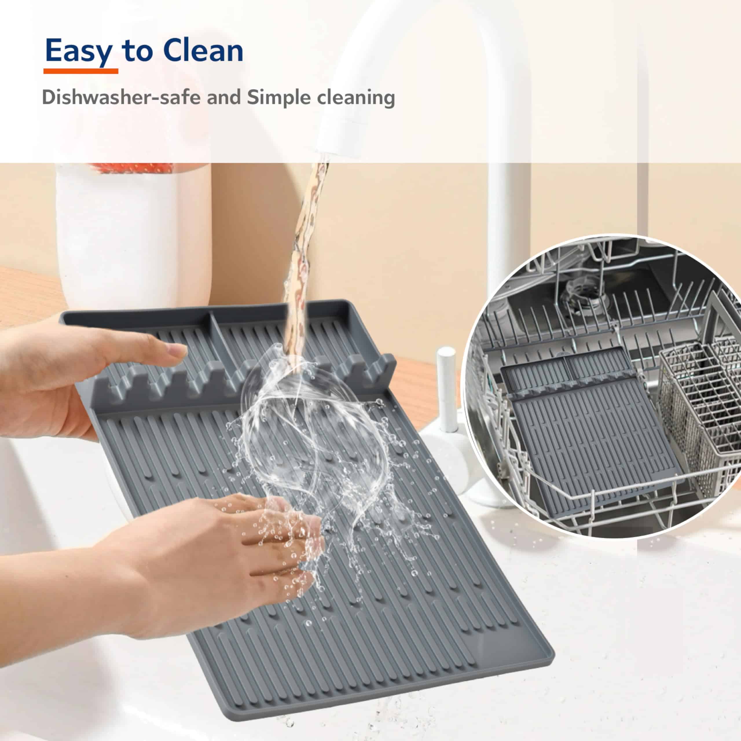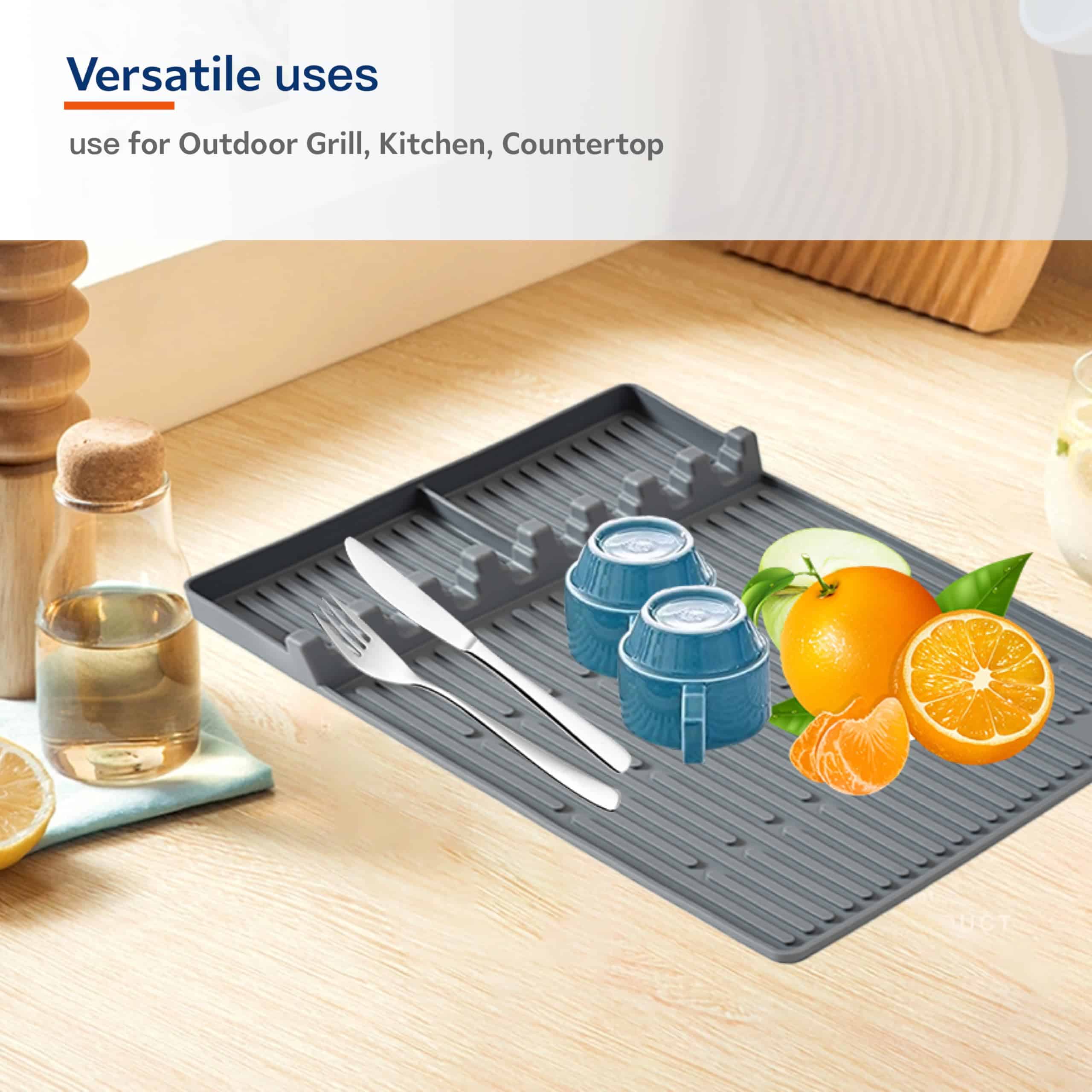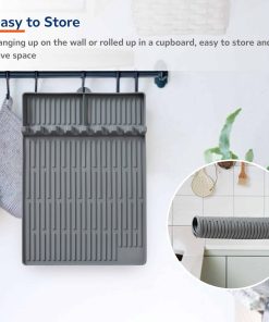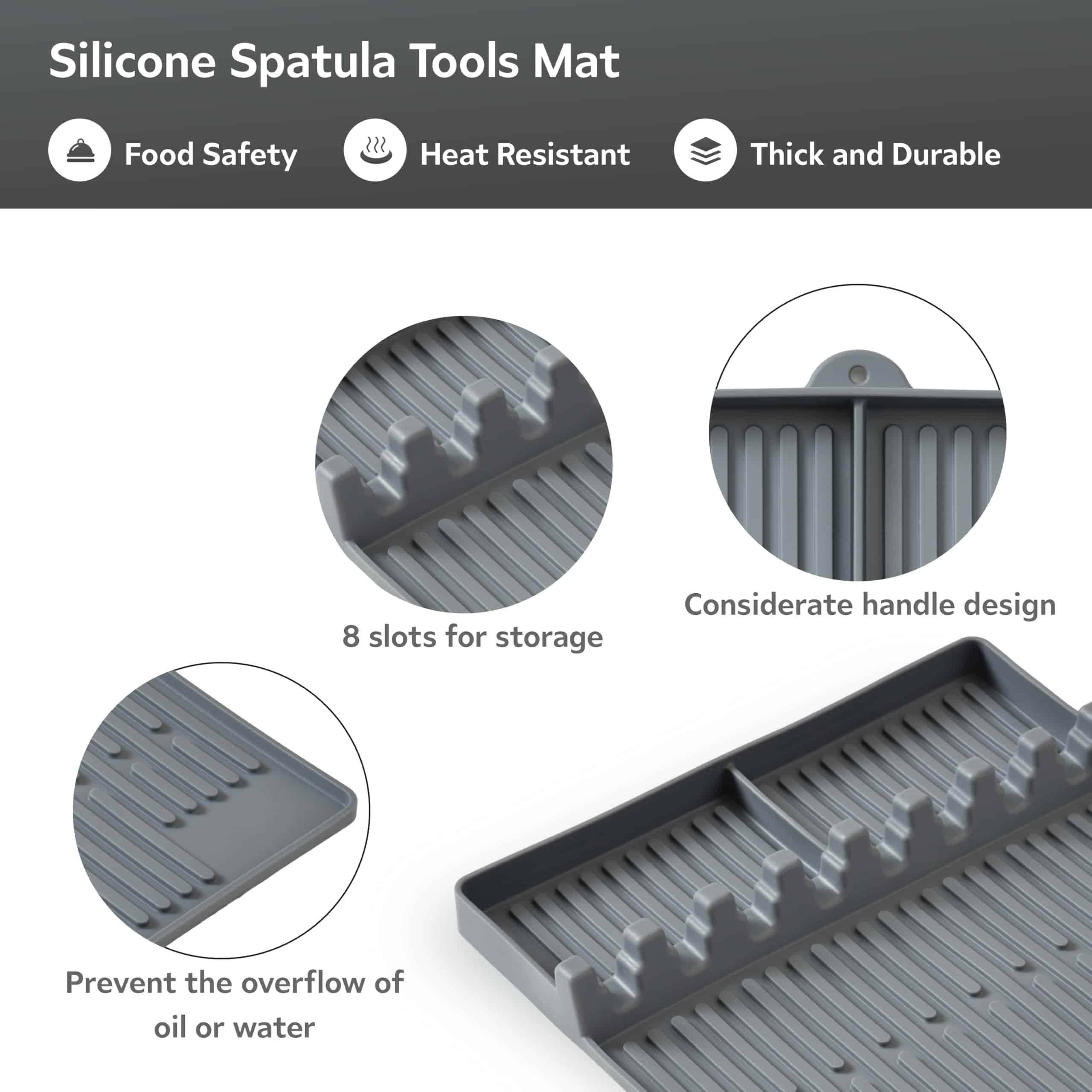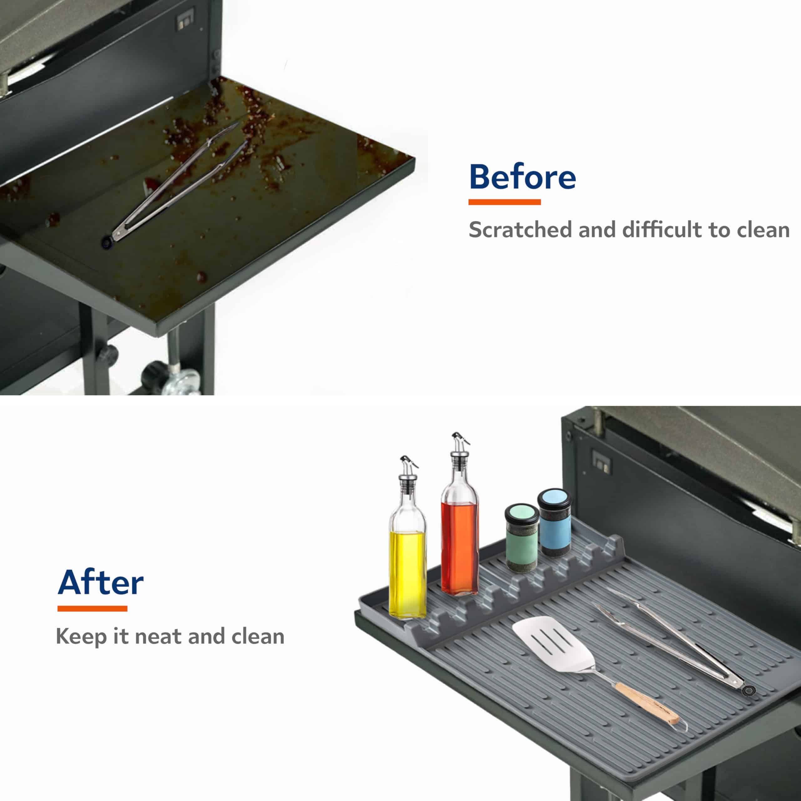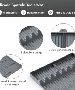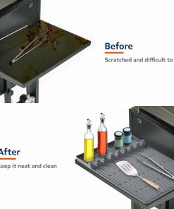 1. Tamaño práctico y grosor mejorado. Longitud: 16» Ancho: 11.5», diseño resistente y grueso, suave y flexible. Úsalo como soporte para condimentos de la parrilla BBQ o para guardar varios utensilios. 2. Diseño versátil. Nuestro tapete de parrilla cuenta con un tamaño más grande de 16×11.5″ con 13 ranuras, proporcionando un amplio espacio para estacionar tus utensilios y mantenerlos separados mientras realizas múltiples tareas, perfecto para organizar tarros de condimentos y más en el estante lateral de Blackstone. 3. Silicona resistente para alimentos. El tapete de herramientas de plancha está hecho de material de silicona 100% apto para alimentos para garantizar la seguridad y la salud. 4. Fácil de limpiar. La superficie de los accesorios de la plancha Blackstone es antiadherente, resistente al agua, a prueba de aceite y resistente a las manchas, lo que se puede lavar rápidamente, reduciendo la carga de limpieza y disfrutar del tiempo agradable de la barbacoa. 5. Elección de regalo ideal. Nuestro tapete de espátula de silicona es una adición práctica a cualquier cocina o encimera. Es una excelente elección de regalo para los entusiastas de la barbacoa y es perfecto para los estantes laterales de Blackstone.