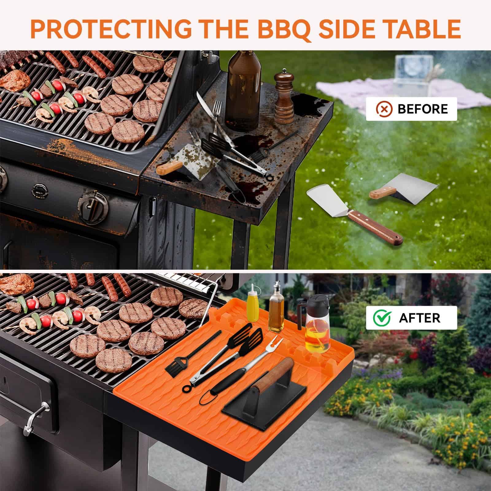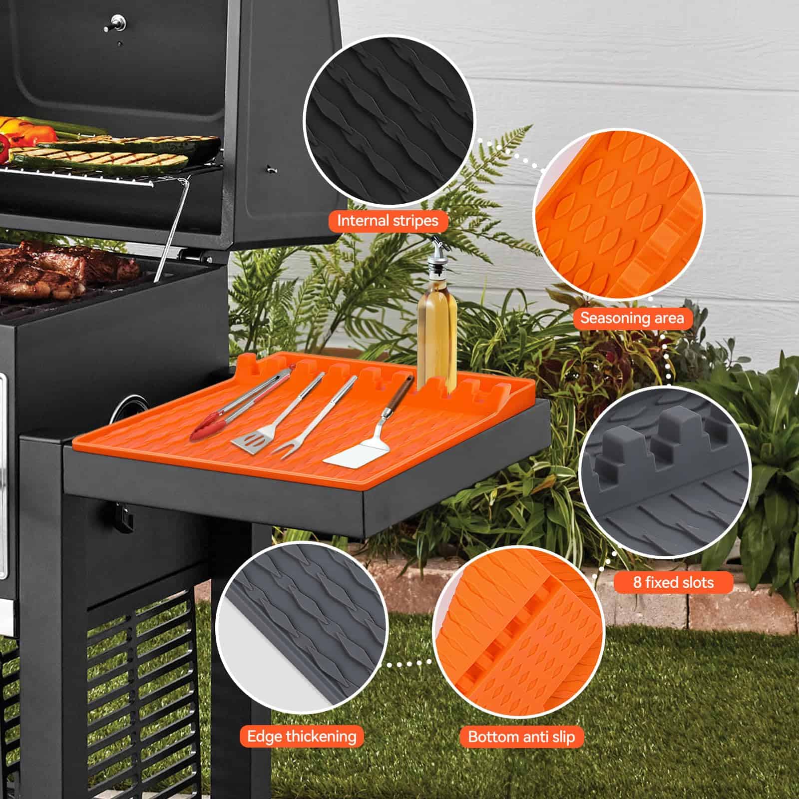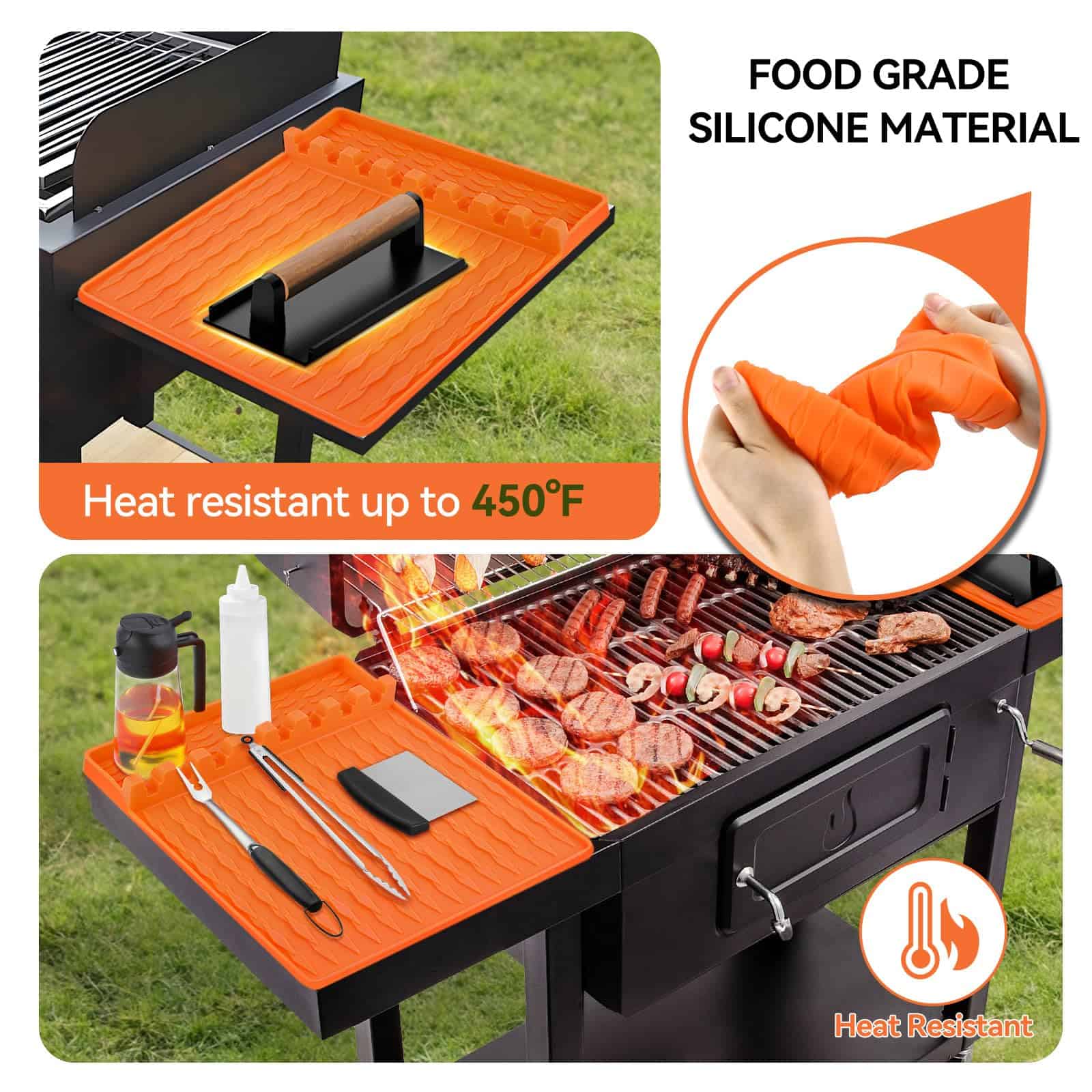 COMPREHENSIVE PROTECTION SIDE TABLE: Protect your grill with the Silicone Griddle Mat for Blackstone Accessories. This essential accessory prevents scratches on the grill surface, preserving its coating. The Silicone Griddle Mat for Blackstone safeguards the grill side rack from stains, scratches, and heat damage while catching any dripping oil or soup. The Silicone Griddle Mat for Blackstone Accessories helps you avoid damage caused by placing metal utensils directly on the Blackstone side tray. FOOD GRADE SILICONE MATERIAL: Heat Resistant Spatula Mat for Blackstone Griddle Crafted from Food-Grade Silicone, Offers Exceptional Durability and can Withstand Temperatures Ranging From -40 to 450 . Designed for Cooking Safety, Spatula Mat for Blackstone Griddle Can be Placed Close to Heat Sources Without Concern. Spatula Mat for Blackstone Griddle is Highly Elastic and Tough, Resistant to Tearing or Deformation, Ensuring it Maintains its Shape and Function Over Time. NON-SLIP AND SPILL-PROOF DESIGN: Featuring Extra-Large 16 X 11.8 Inch Silicone Grill Mat with 8 Slots, Silicone Grill Mat for Blackstone Griddle Accessories Effectively Prevents Tools From Rolling or Sliding. Silicone Grill Mat Design Not Only Keeps Tools from Touching Unclean Surfaces, Reducing The Risk of Cross-Contamination, But Also Maintains Cleanliness By Preventing Dressing Sauce or Grease From Spilling Over With its Raised Edges. EASY TO CLEAN & STORE: Compatible for Blackstone Silicone Griddle Mat are Highly Resistant to Stains, Repelling Grease and Food Residue. Any Stains Can be Easily Cleaned with Water or In A Dishwasher. Featuring Hanging Holes for Effortless Storage on Hooks or Racks, Compatible for Blackstone Silicone Griddle Mat Can Also be Rolled or Folded for Added Convenience. Compatible for Blackstone Silicone Griddle Mat Quick Drying Capability Prevents Bacterial Growth, Ensuring Hygienic Use. MULTIFUNCTIONAL: The Silicone Griddle Spatula Mat for Blackstone is an ideal choice for both home kitchens and outdoor barbecues, thanks to its versatility. Silicone Griddle Spatula Mat for Blackstone high temperature resistance, easy cleaning, and multi-functional design make it a practical must-have. Whether you need to protect your tabletop, assist with cooking, or support family activities, Silicone Griddle Spatula Mat for Blackstone has you covered.