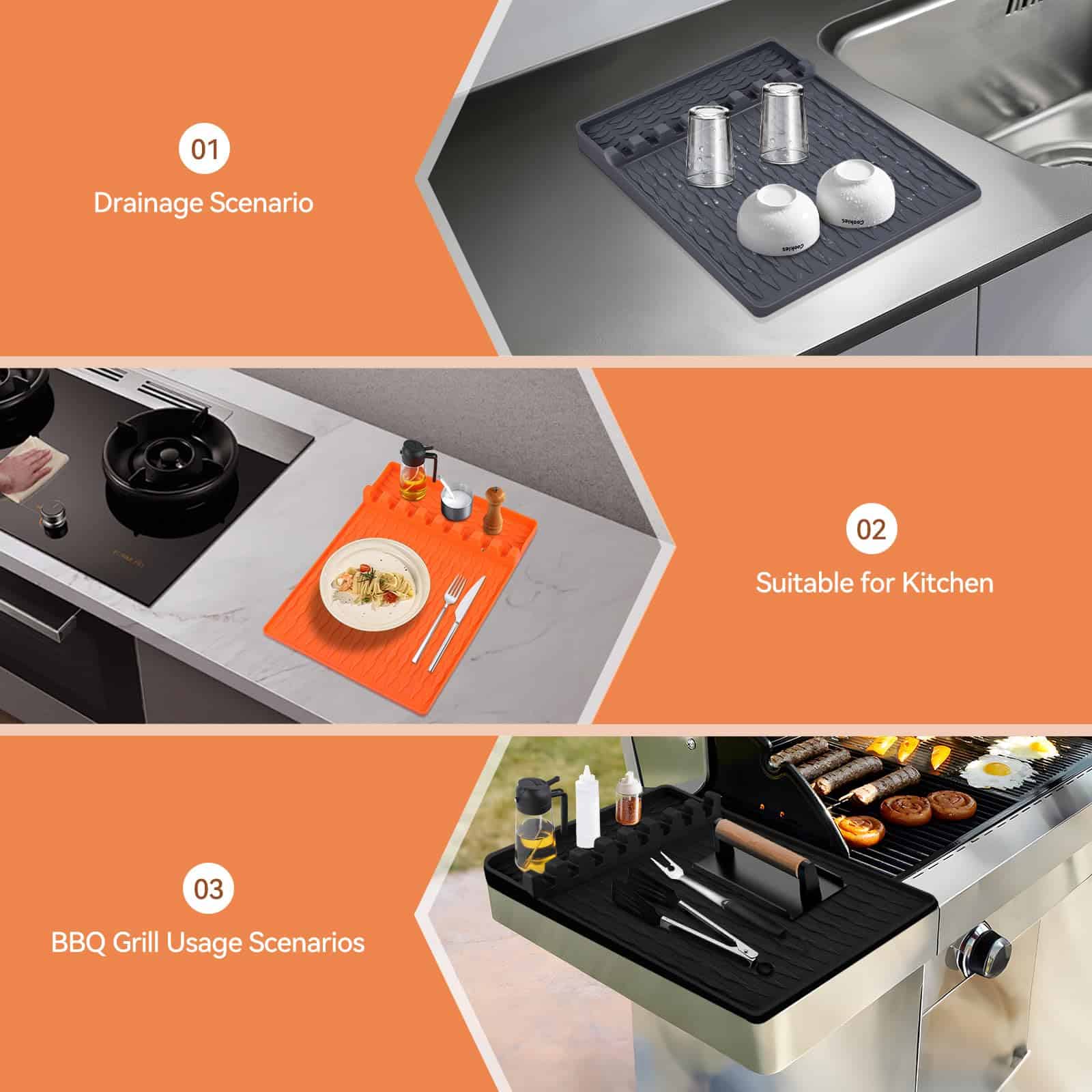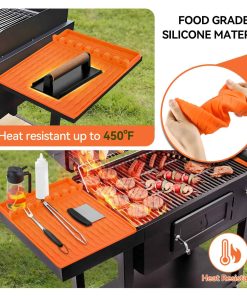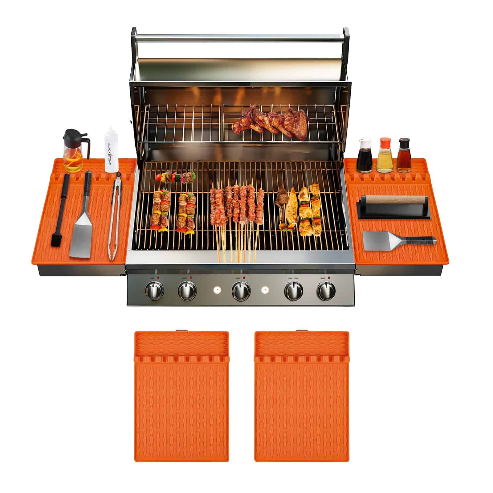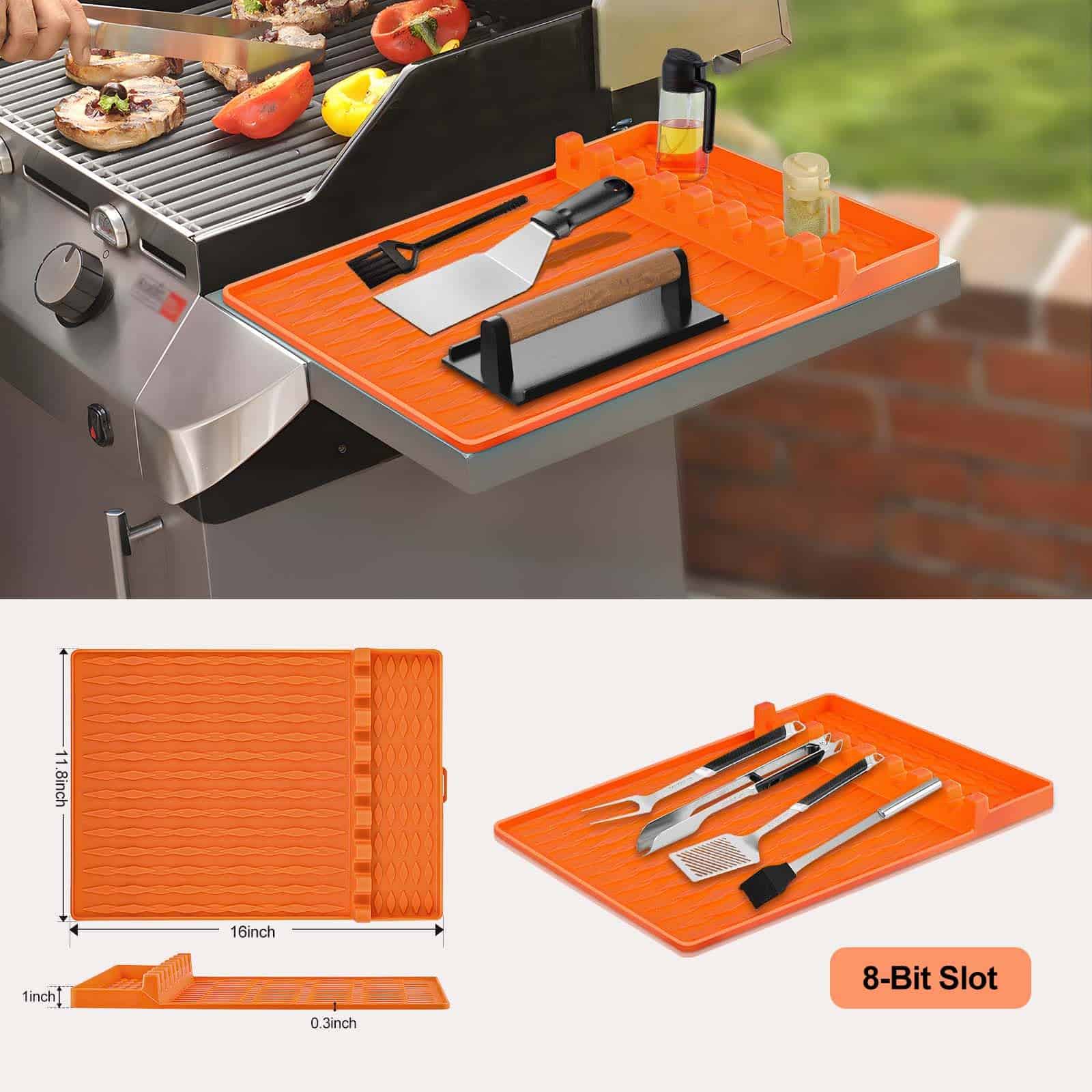 COMPREHENSIVE PROTECTION SIDE TABLE: Protect your grill with the Silicone Griddle Mat for Blackstone Accessories. This essential accessory prevents scratches on the grill surface, preserving its coating. The Silicone Griddle Mat for Blackstone safeguards the grill side rack from stains, scratches, and heat damage while catching any dripping oil or soup. The Silicone Griddle Mat for Blackstone Accessories helps you avoid damage caused by placing metal utensils directly on the Blackstone side tray. FOOD GRADE SILICONE MATERIAL: Heat Resistant Spatula Mat for Blackstone Griddle Crafted from Food-Grade Silicone, Offers Exceptional Durability and can Withstand Temperatures Ranging From -40 to 450 . Designed for Cooking Safety, Spatula Mat for Blackstone Griddle Can be Placed Close to Heat Sources Without Concern. Spatula Mat for Blackstone Griddle is Highly Elastic and Tough, Resistant to Tearing or Deformation, Ensuring it Maintains its Shape and Function Over Time. NON-SLIP AND SPILL-PROOF DESIGN: Featuring Extra-Large 16 X 11.8 Inch Silicone Grill Mat with 8 Slots, Silicone Grill Mat for Blackstone Griddle Accessories Effectively Prevents Tools From Rolling or Sliding. Silicone Grill Mat Design Not Only Keeps Tools from Touching Unclean Surfaces, Reducing The Risk of Cross-Contamination, But Also Maintains Cleanliness By Preventing Dressing Sauce or Grease From Spilling Over With its Raised Edges. EASY TO CLEAN & STORE: Compatible for Blackstone Silicone Griddle Mat are Highly Resistant to Stains, Repelling Grease and Food Residue. Any Stains Can be Easily Cleaned with Water or In A Dishwasher. Featuring Hanging Holes for Effortless Storage on Hooks or Racks, Compatible for Blackstone Silicone Griddle Mat Can Also be Rolled or Folded for Added Convenience. Compatible for Blackstone Silicone Griddle Mat Quick Drying Capability Prevents Bacterial Growth, Ensuring Hygienic Use. MULTIFUNCTIONAL: The Silicone Griddle Spatula Mat for Blackstone is an ideal choice for both home kitchens and outdoor barbecues, thanks to its versatility. Silicone Griddle Spatula Mat for Blackstone high temperature resistance, easy cleaning, and multi-functional design make it a practical must-have. Whether you need to protect your tabletop, assist with cooking, or support family activities, Silicone Griddle Spatula Mat for Blackstone has you covered.