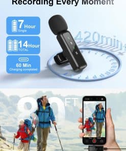 3. LARGA DURACIÓN: Disfruta de hasta 14 horas de grabación ininterrumpida con nuestro compacto y duradero micrófono de solapa. Úsalo para grabación individual (14 horas) o en pareja (7 horas). Clipéalo fácilmente en tu cuello. Puedes cargar tu teléfono mientras grabas para asegurar una grabación continua.