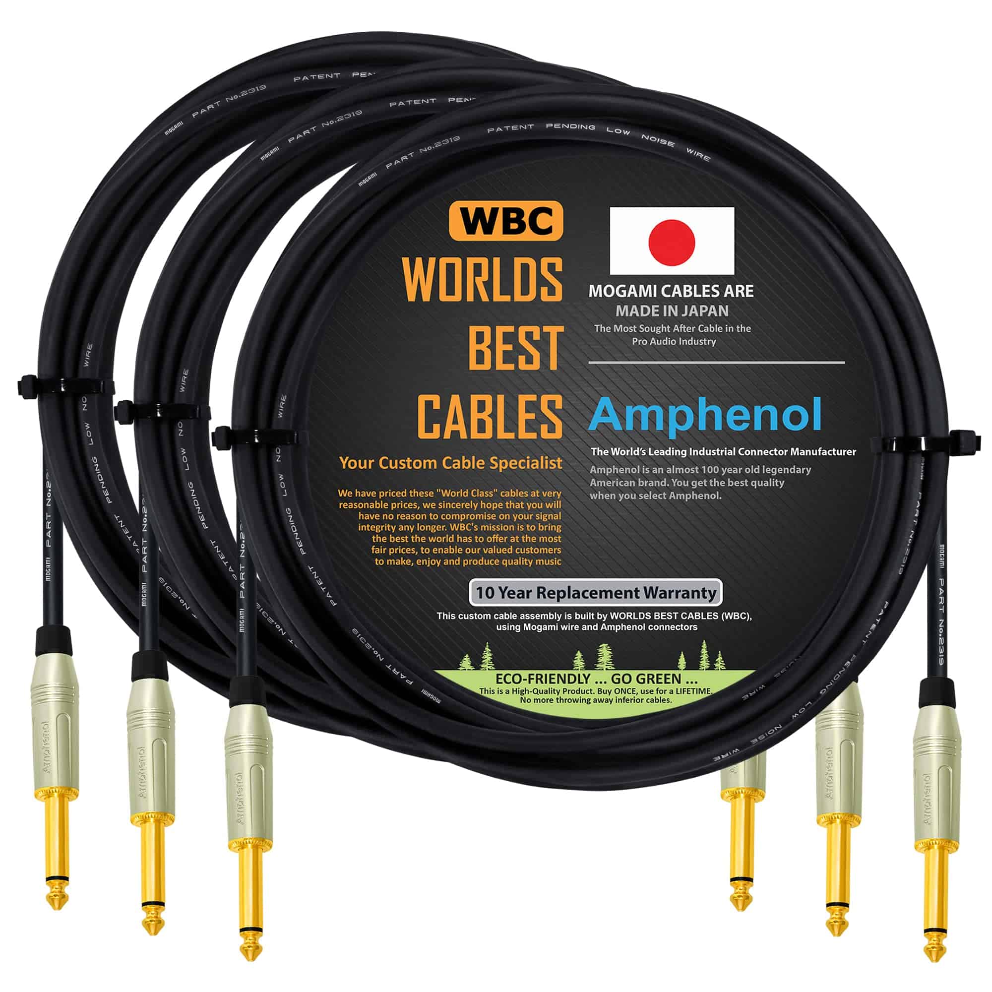 Este es un conjunto de cables personalizados construidos por WORLDS BEST CABLES (WBC). Este conjunto de cables está hecho usando el cable Mogami 2319 y los Plugs TS Dorados Amphenol de la Serie M. En WBC siempre hacemos conjuntos de cables personalizados de clase mundial utilizando muchas de las marcas líderes de cables y conectores, si no puedes encontrar la longitud y tipo de cable que buscas, no dudes en contactarnos, nos esforzaremos por ensamblar el cable necesario para ti. IMPORTANTE, TEN EN CUENTA: La longitud del cable se mide desde la PARTE SUPERIOR DE LA MANGA (Plug Recto) hasta la PARTE SUPERIOR DE LA MANGA (Plug Recto) de cada conector (los detalles de la medición se muestran claramente en una de las imágenes de la galería para aclarar aún más el proceso de medición. Hay muchas imágenes en la galería, haz clic en la imagen principal para abrir la galería completa).