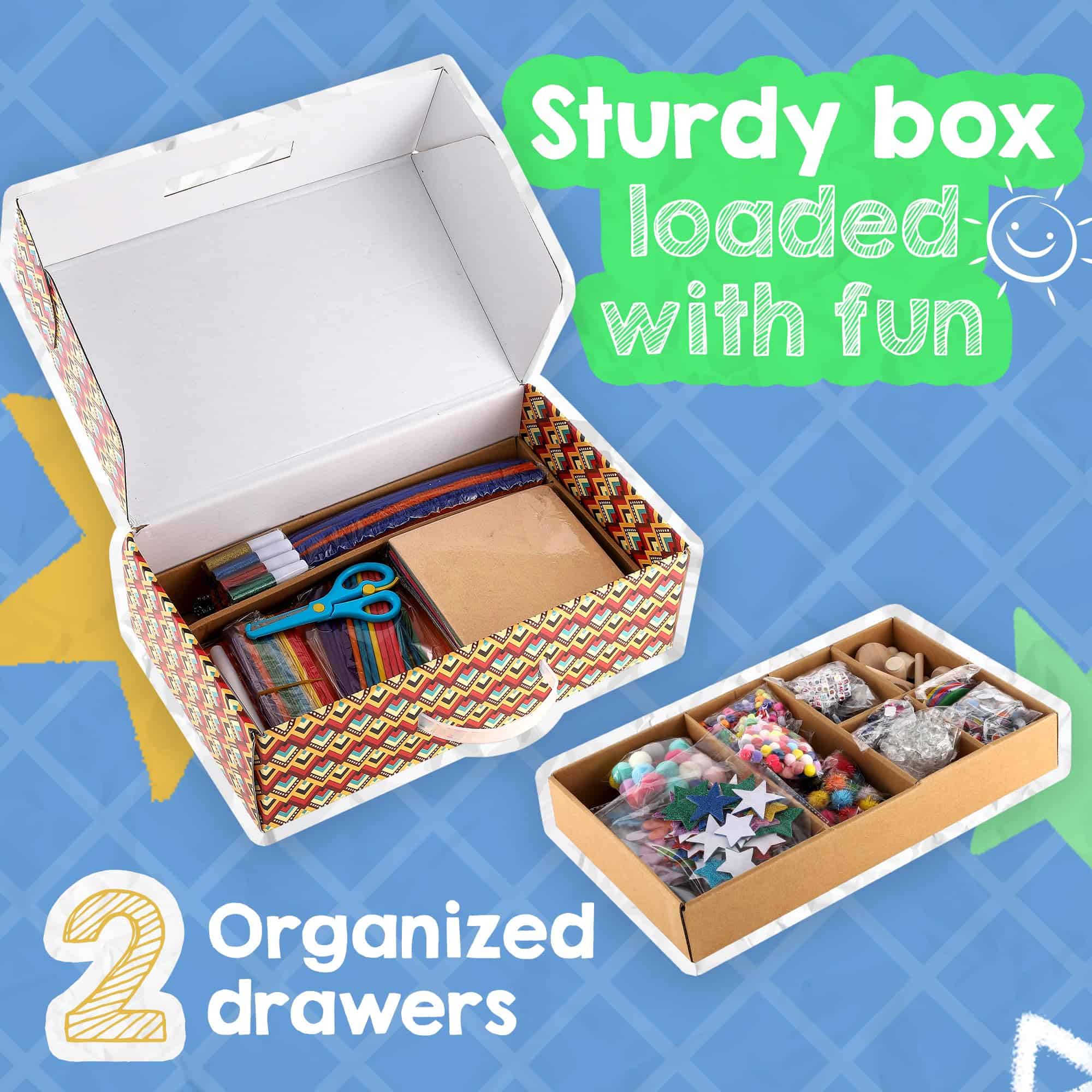 1. ¡A LOS NIÑOS LES ENCANTA HACER MANUALIDADES: Hacer manualidades no solo es divertido, sino también educativo, por lo que es una elección ideal para los niños. Nuestro kit de manualidades está diseñado específicamente para inspirar y fomentar la imaginación de su hijo, ofreciendo una amplia variedad de más de 3000 piezas y 99 proyectos únicos para elegir. 2. HORAS DE DIVERSIÓN: Mira cómo los niños se sumergen en horas de creatividad. Con 99 actividades proporcionadas en nuestro folleto, así como infinitas posibilidades de exploración imaginativa, estarán ocupados creando artículos, decoraciones y accesorios para usar. Las opciones son ilimitadas. 3. CAJA RESISTENTE LLENA DE DIVERSIÓN: Mantén todo organizado con la ayuda de nuestra resistente caja que viene con 2 niveles de compartimentos, asegurando que todos tus elementos se mantengan ordenados y listos para la diversión. 4. TODO LO QUE NECESITAS Y MÁS: Nuestra caja de manualidades definitiva incluye pegamento, tijeras de seguridad, letras, cuentas, limpiapipas, botones, cañas metálicas, artesanías de madera, pompones, plumas, palitos de helado, gemas, ojos móviles y mucho más. 5. EL REGALO PERFECTO: El Kit de Manualidades A&R es una excelente elección de regalo para cualquier niño. Despertando su creatividad e imaginación, atrae tanto a niñas como a niños. Adecuado para niños de 4 a 12 años, ofrece una experiencia única y agradable.