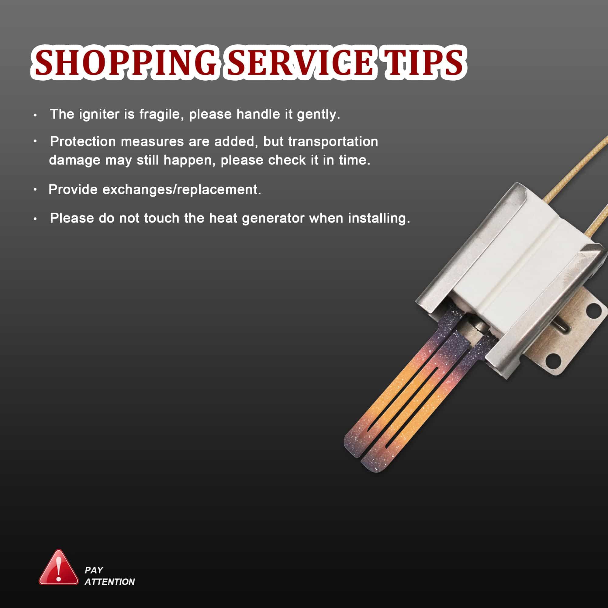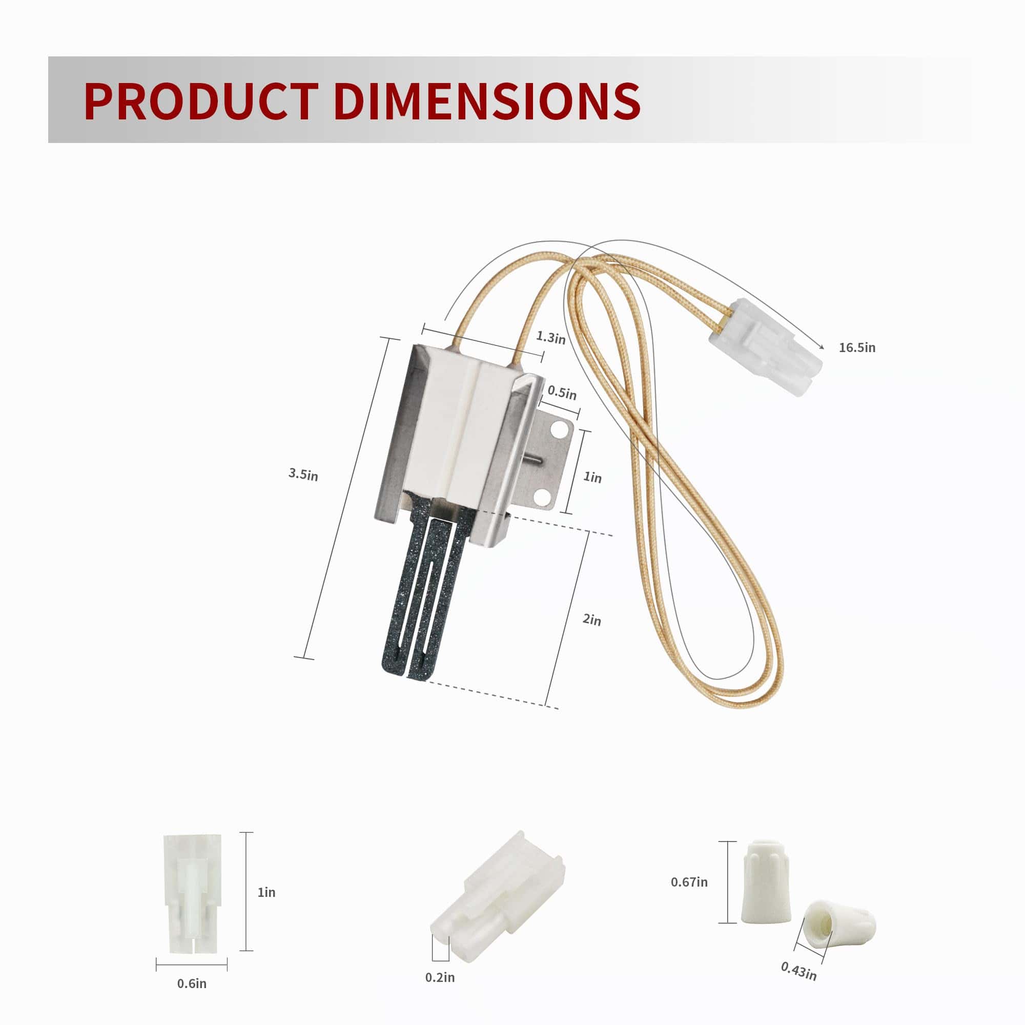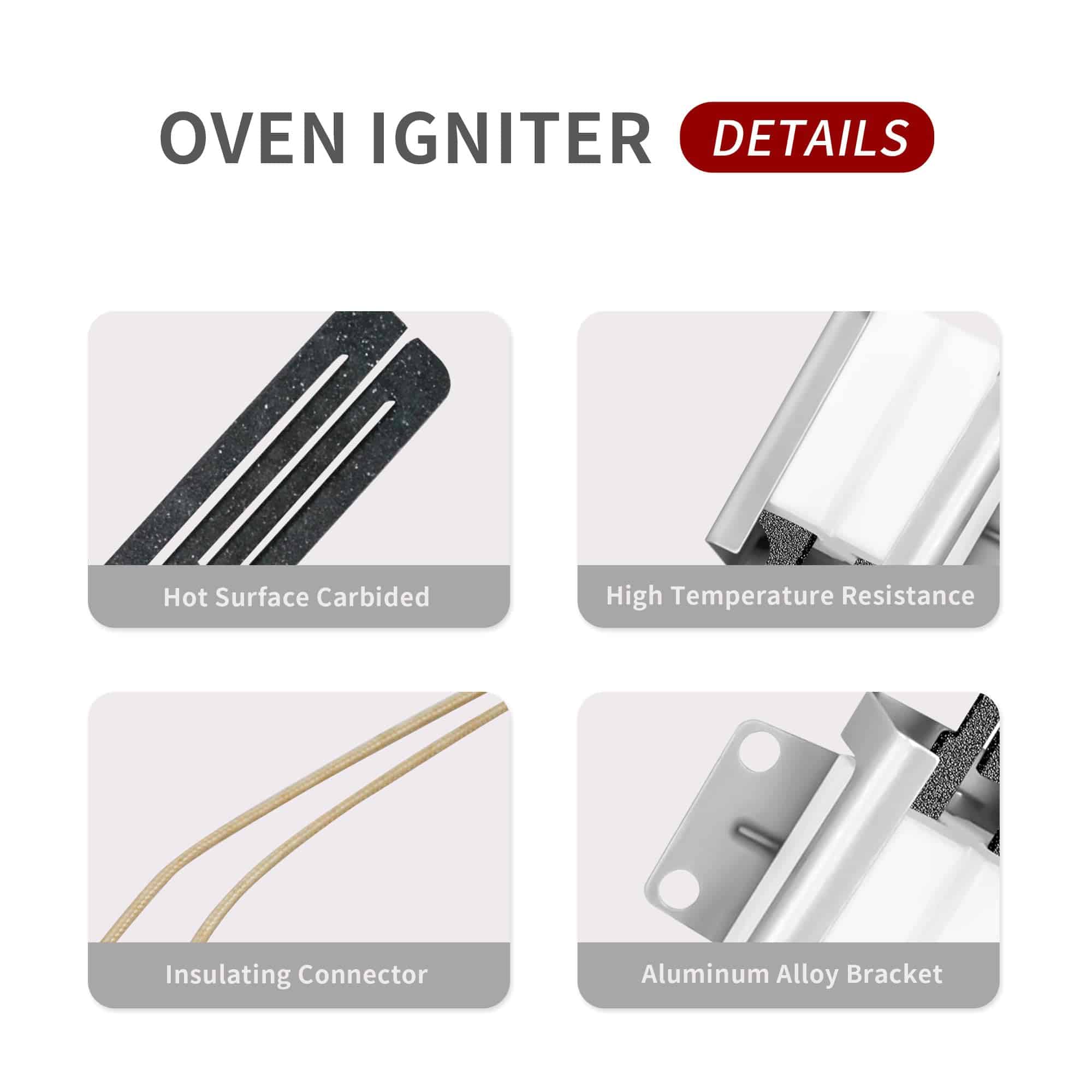 1. Ignitor plano 316489400 para horno de cocina a gas. 2. Soluciona los siguientes síntomas: Ignitor quemado. Ignitor no se calienta lo suficiente. Desagradable olor a gas. Horno no puede calentarse. Horno no encenderá. 3. El paquete incluye 1 x Ignitor 316489400 para horno de cocina y 2 piezas de tuercas de alambre de porcelana. 4. Calidad Premium: El reemplazo de ignitor para horno está hecho de metal duradero, el material puede soportar altas temperaturas, cable aislado lo suficientemente largo. Este reemplazo de ignitor plano ha sido probado para garantizar su durabilidad. 5. Consejos de compra: El elemento ignitor incluye un extremo de enchufe conectado, 2 tuercas de alambre de cerámica, escudo metálico alrededor de la cerámica. El elemento ignitor es extremadamente frágil, por favor preste atención a manejar con cuidado, no lo rompa ni lo coloque en un ambiente húmedo.
