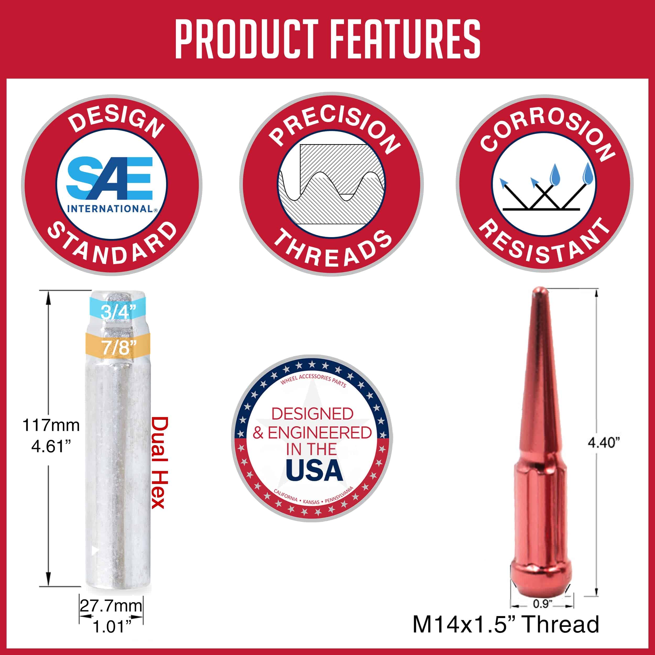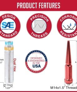 3. 32 Pcs 4.4″ Largo M14x1.5 Rosca Camión Spline Asiento Cónico 60 Grados Espigado Acabado Rojo Construcción de 1 Pieza.
