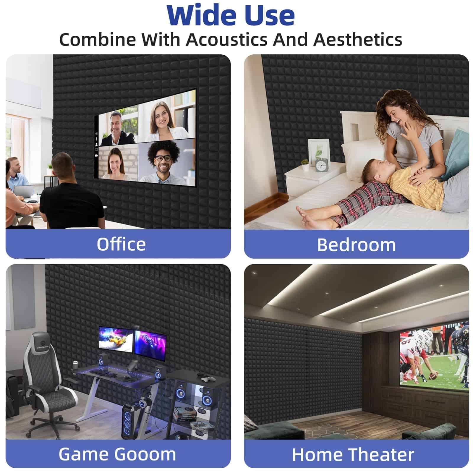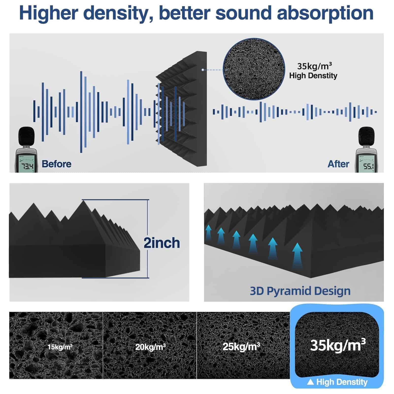 Diseñados para absorber sonido y reducir ruido, estos paneles de espuma insonorizante para pared son ideales para crear un entorno tranquilo en hogares, estudios de grabación profesionales, áreas de streaming y entornos sensibles al ruido. Con un diseño piramidal único que reduce el eco y el ruido, estos paneles acústicos de alta densidad de 35kg/m ofrecen un coeficiente de reducción de ruido (NRC) de 0.98, garantizando un audio claro en cualquier espacio. Además, su rápida expansión les permite alcanzar su forma y tamaño completos en poco tiempo. Son autoadhesivos, fáciles de instalar y decorativos, pudiendo adherirse a diversas superficies lisas. Fabricados con materiales ecológicos y seguros, los paneles de espuma insonorizante son no tóxicos, inodoros, sin formaldehído y resistentes al fuego, lo que los hace aptos para su uso en dormitorios, salas de estar, oficinas, salas de grabación, entre otros espacios. Su alta densidad y capacidad de absorción acústica los convierten en tratamientos acústicos de calidad de estudio profesional, ayudando a crear ambientes libres de estrés y propicios para la creatividad.