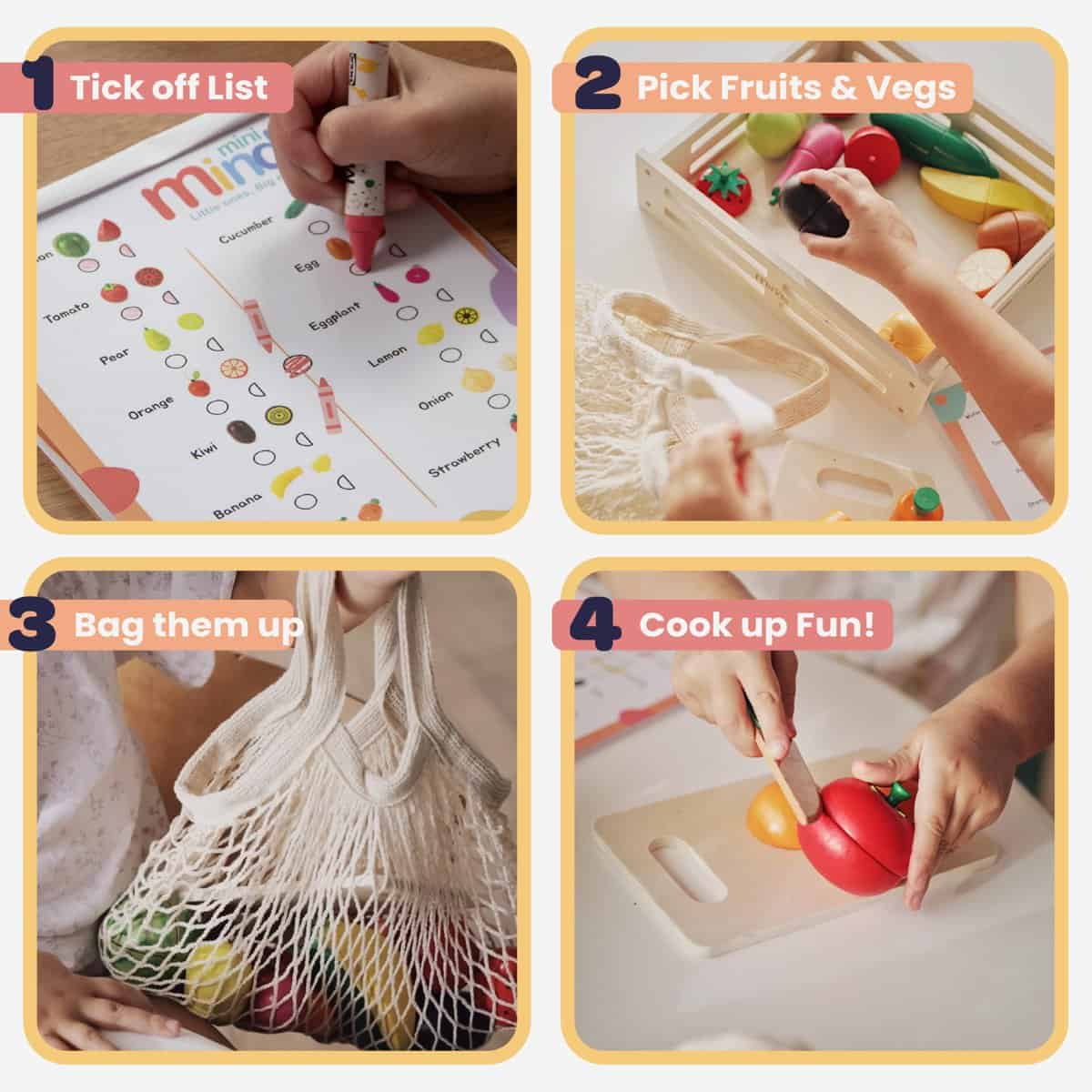 2. ¡Diversión de compras en casa! Experimenta divertidas compras de supermercado con MiniMinds para niños de 3-5 años. Este set incluye una bolsa de compras y una lista para la máxima y realista experiencia de juego de roles con comida de mentira.