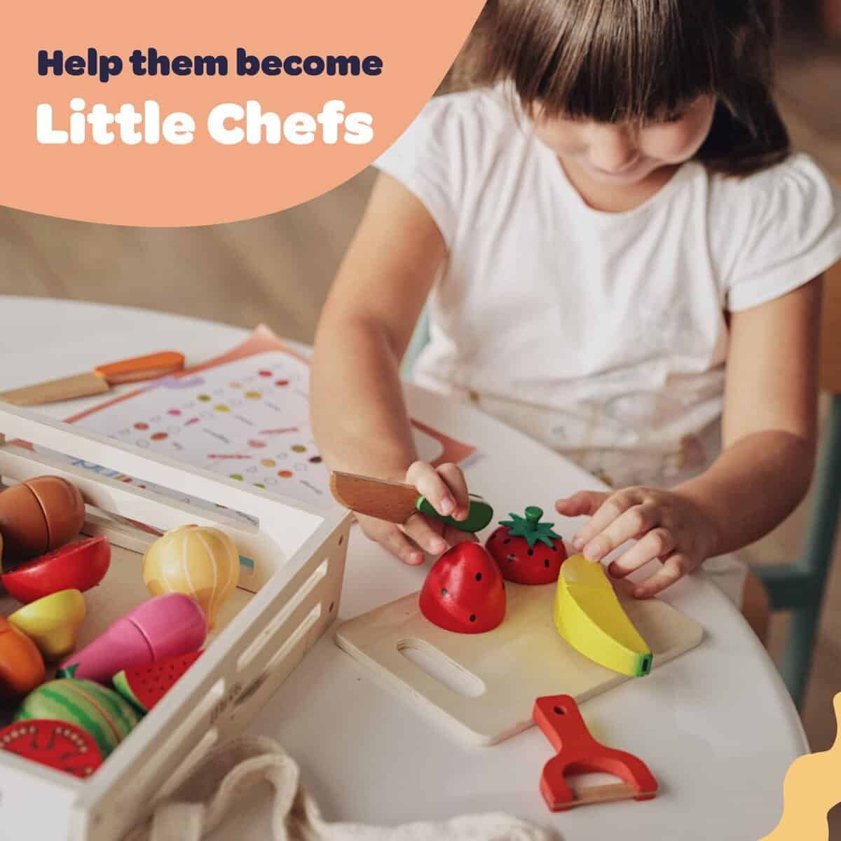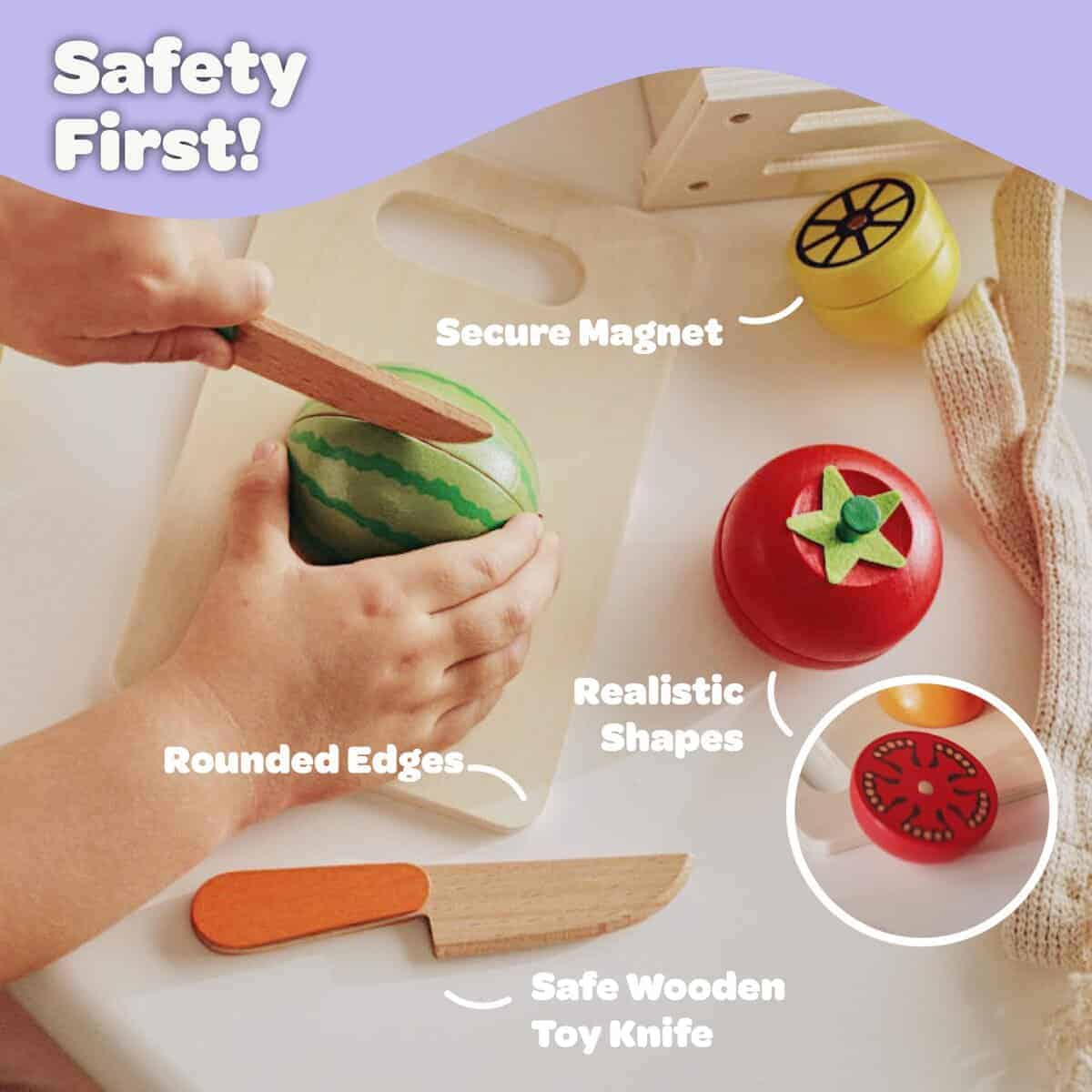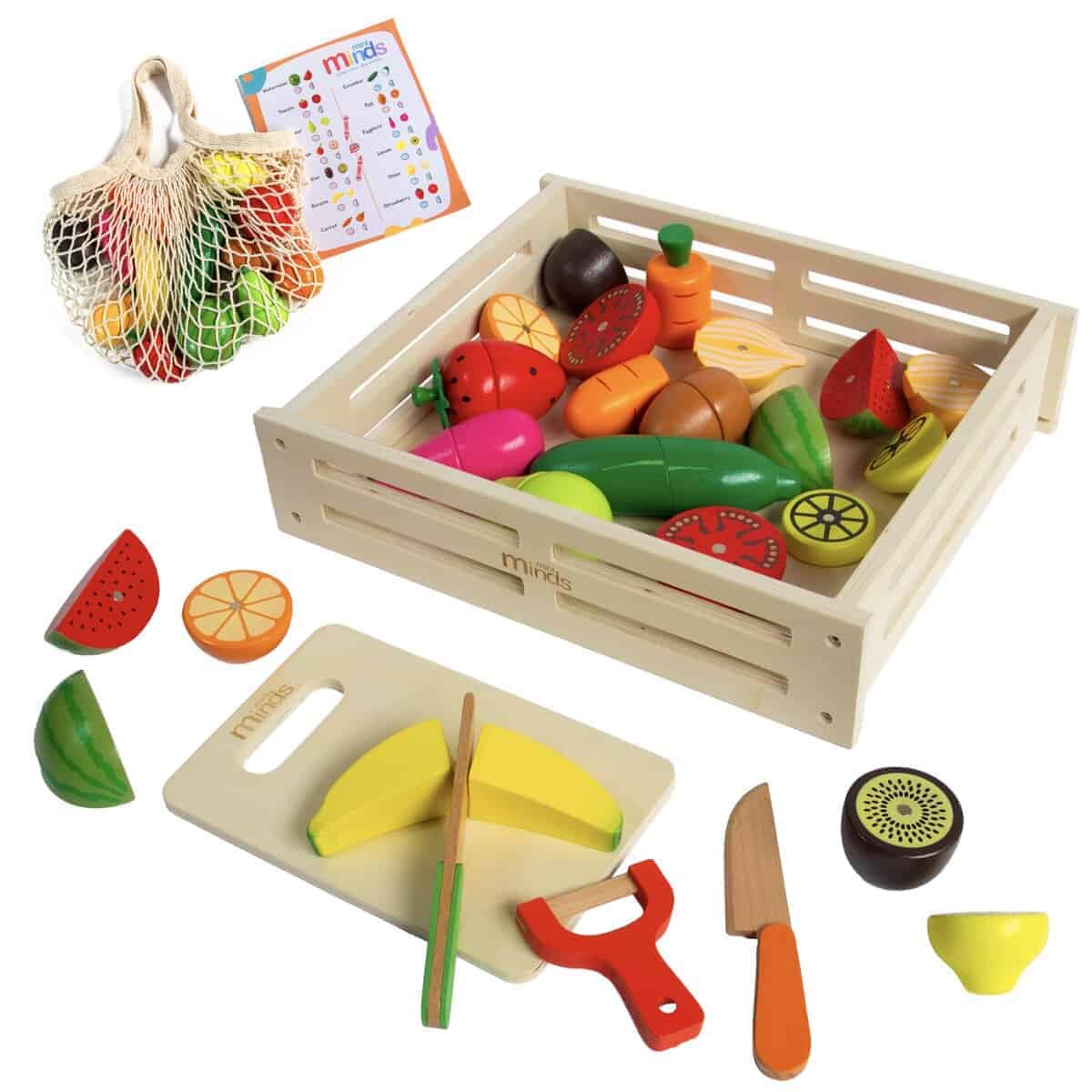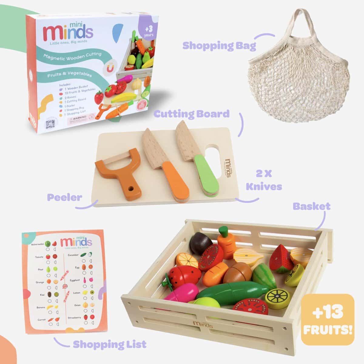 5. ¡Conoce a Miniminds! ¡Tu opción para jugar educativo innovador! Nuestros Juguetes de Comida de Corte Magnética y Juguetes de Corte de Comida para Niños Pequeños, parte de nuestra colección de juguetes de madera, hacen que el aprendizaje sea divertido, seguro y de alta calidad con el set de cocina para niños.