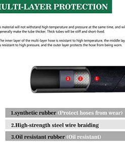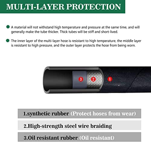3. Protección multicapa, caucho sintético resistente al aceite en el interior del tubo, una capa de trenza antitéxtil en el medio y un caucho sintético duradero en el exterior para proteger la manguera del desgaste.