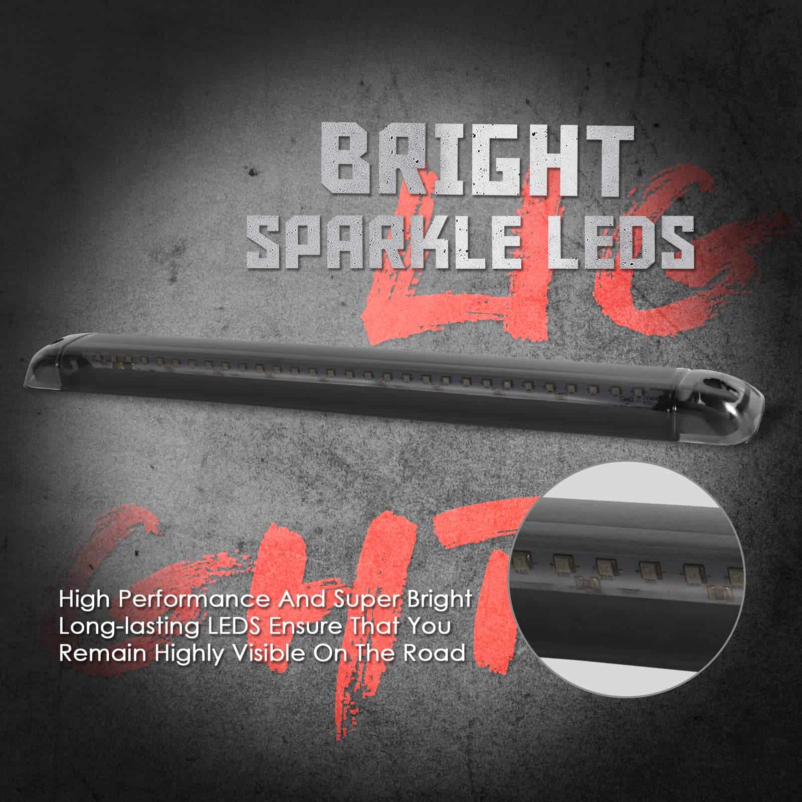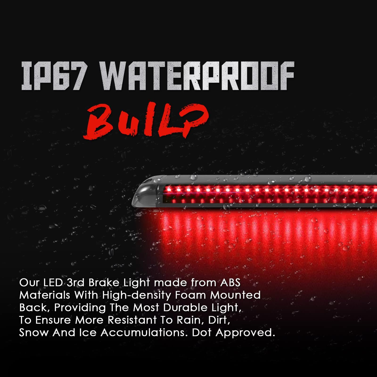 3. Impermeable IP67: Listo para cualquier tipo de clima. Esta 3ra Luz de Freno LED está hecha de materiales ABS con espuma de alta densidad en la parte posterior, proporcionando la luz más duradera, para garantizar mayor resistencia a la lluvia, suciedad, nieve y acumulaciones de hielo.