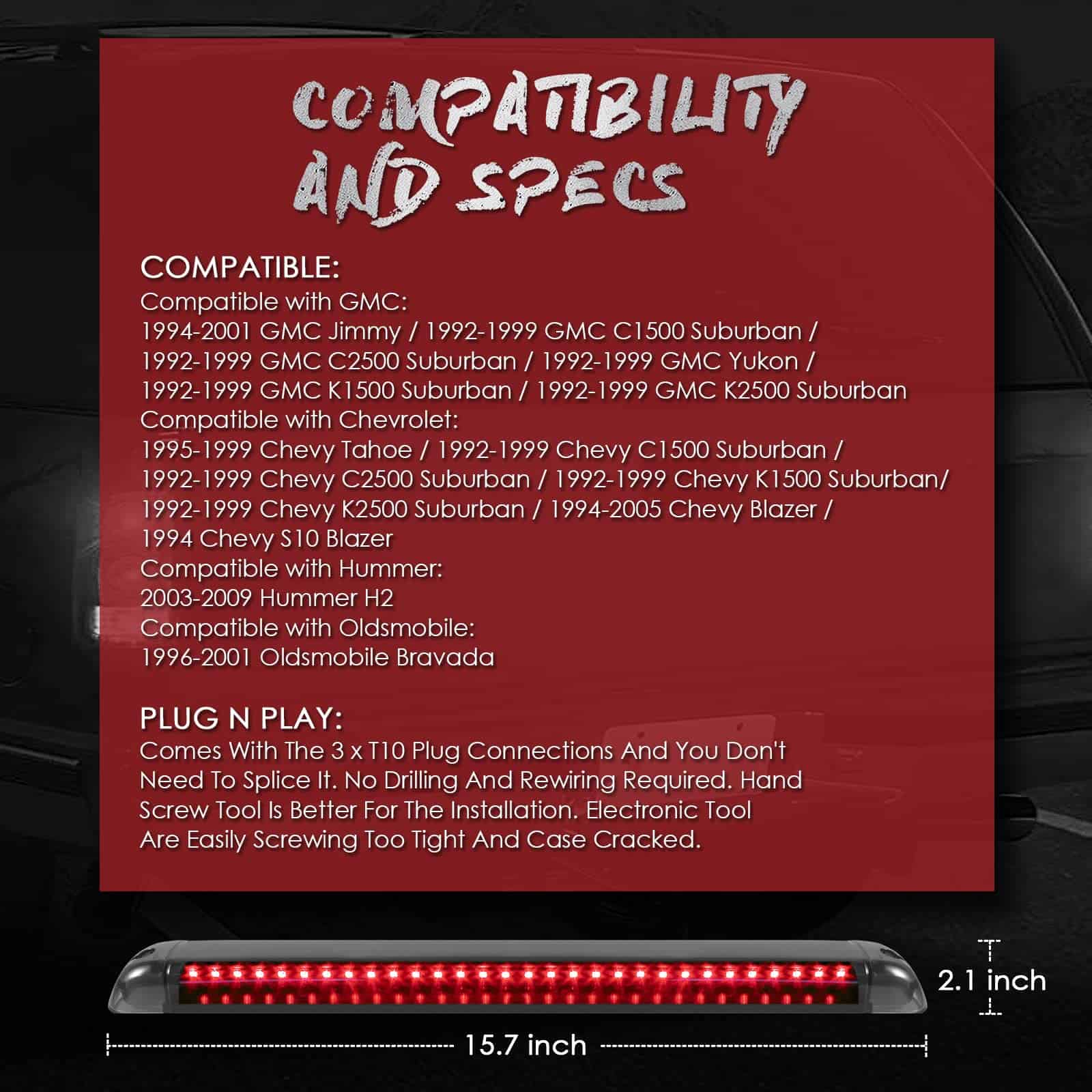 5. Lo que recibes: 1 X Luz de Freno Trasera de Alta Montaje para modelos 1992-1999 GMC / Chevrolet Chevy C1500 C2500 K1500 K2500 & Suburban, Yukon, Tahoe; 1994-2001 GMC Jimmy; 1994-2005 Chevrolet Blazer; 2003-2009 Hummer H2; 1996-2001 Oldsmobile Bravada.