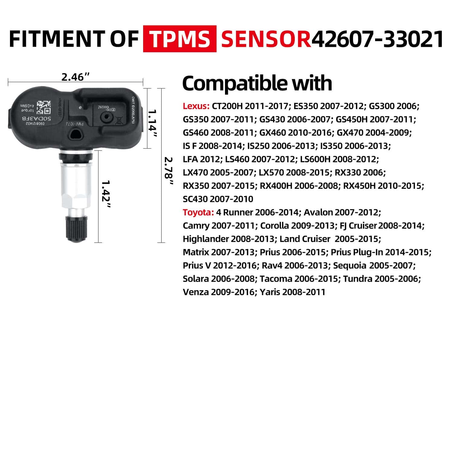 Sensor TPMS compatible con una amplia gama de modelos Lexus y Toyota. Cuenta con una alta presión y larga vida útil gracias a su proceso de preprogramación especial. Cada sensor ha sido probado al 100% para garantizar una instalación sin problemas y un rendimiento óptimo. La batería de este sensor está diseñada para durar hasta 10 años bajo condiciones normales de uso y puede soportar temperaturas de hasta 120 grados. Si por alguna razón no estás completamente satisfecho con nuestro Sensor de Monitoreo de Presión de Neumáticos (TPMS), no dudes en contactarnos. Nuestro equipo de servicio al cliente trabajará arduamente para resolver cualquier problema que puedas tener y asegurarse de que tengas una buena experiencia de compra con nosotros.
