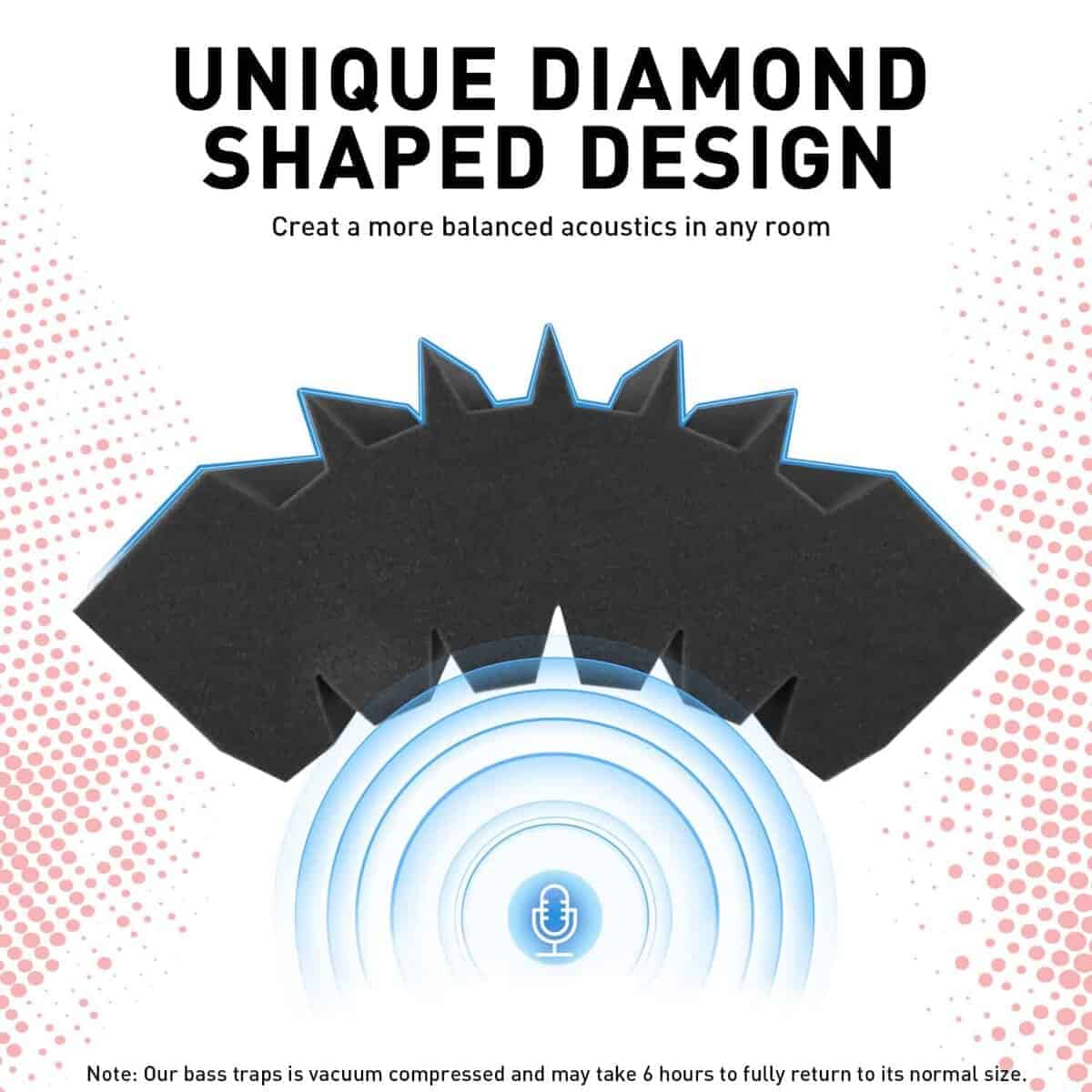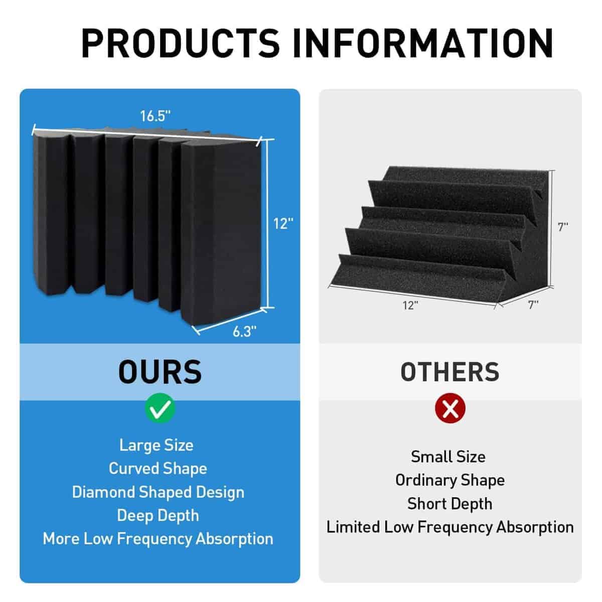 5. Fácil de Instalar: Las trampas de graves en esquina de 12″ X 7″ X 7″ instaladas en techos y esquinas de una habitación asegurarán el equilibrio de la forma de onda en la parte de baja frecuencia de la curva de respuesta de frecuencia. Se requieren seis piezas de cinta adhesiva para instalar cada cuña en sus paredes.