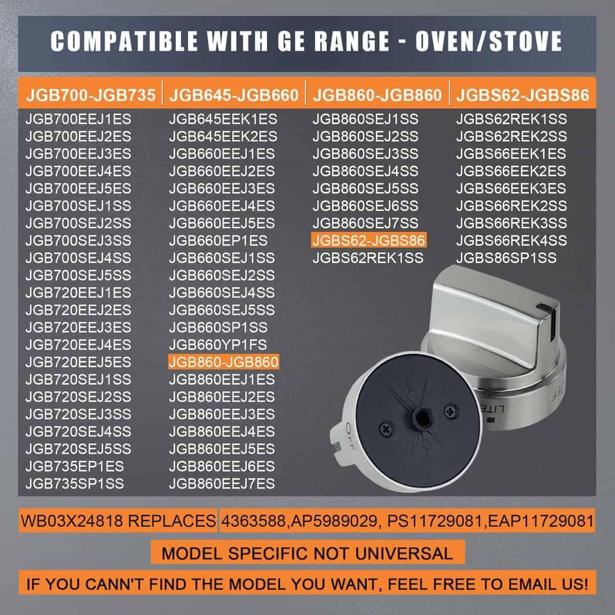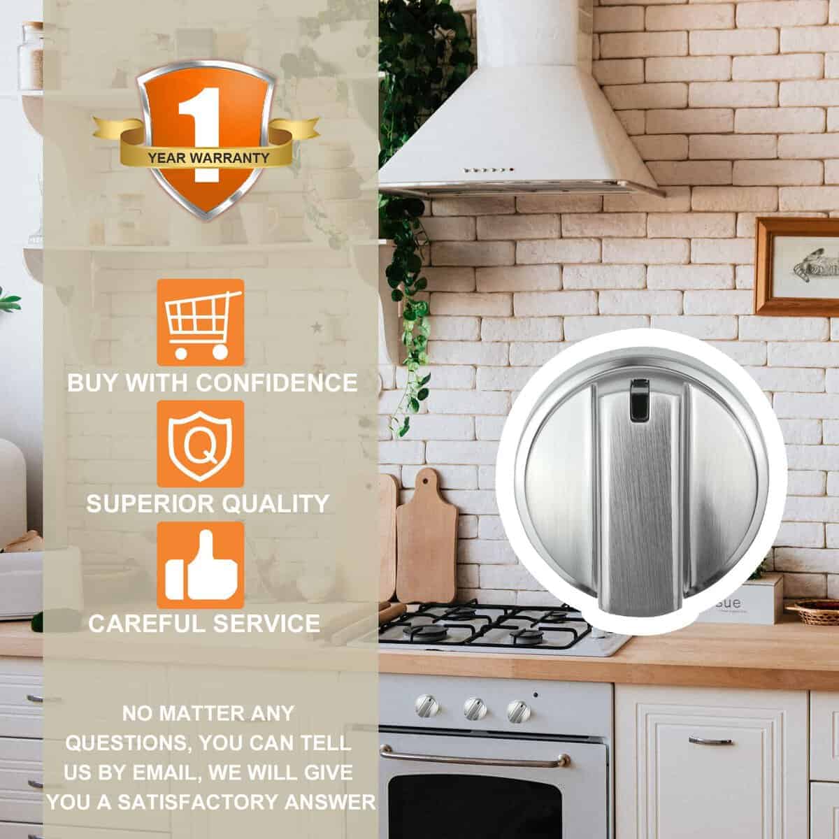 4 Paquete de Perillas de Estufa WB03X24818 ge, Material: 100% acero inoxidable. Dimensiones del artículo LxAxH: 2.2 x 2.2 x 1.9 pulgadas. Orificio en forma de D de aproximadamente 0.59 pulgadas / 15 mm de profundidad y diámetro de 0.2 pulgadas. Nuestras perillas de estufa de gas incluyen 2 perillas por paquete. La aplicación amplia de la perilla de quemador de superficie WB03X24818 le permite controlar el calor del quemador de superficie en la estufa. La perilla WB03X24818 reemplaza a AP5989029, PS11729081 y es compatible con la estufa de gas ge. Fabricado con acero inoxidable puro, resistente al calor, resistente al desgaste y a la presión. Fácil de instalar, simplemente retire la perilla del quemador y reemplácela con una nueva perilla de quemador de estufa WB03X24818 para que su horno de estufa vuelva a funcionar rápidamente en minutos. Compre con confianza, nuestra perilla de estufa WB03X24818 proviene de un fabricante con más de 10 años de experiencia profesional en perillas. Ofrecemos un servicio al cliente 100% satisfactorio. Si por alguna razón no está 100% satisfecho, por favor avísenos, la devolución y el reembolso son nuestro compromiso con los clientes. Le daremos una respuesta satisfactoria en 24 horas, tanto antes como después de la venta.