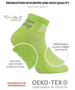 1. CERTIFICADO DE SEGURIDAD – Los puntos de agarre que se utilizan para producir nuestros calcetines son un SISTEMA DE SEGURIDAD muy bueno para tus pies en el mercado. El silicona ABS italiano ubicado en la parte inferior del calcetín ha recibido Oeko Tex Standard 100, GOTS (Global Organic Textile Standard). Para recibir dicho certificado importante, el material pasó por numerosas pruebas que confirmaron la alta calidad y seguridad de nuestros calcetines, a diferencia de los puntos de agarre de goma de baja calidad procedentes de Asia.