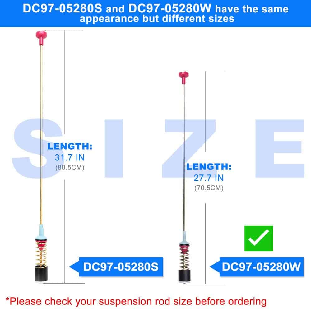 1. Estas varillas de suspensión DC97-05280W soportan la tina de la lavadora y la mantienen estable durante cargas desequilibradas. Actúan como amortiguadores que permiten que la tina de la lavadora se mueva mientras ayudan a minimizar la vibración en el modo de centrifugado.