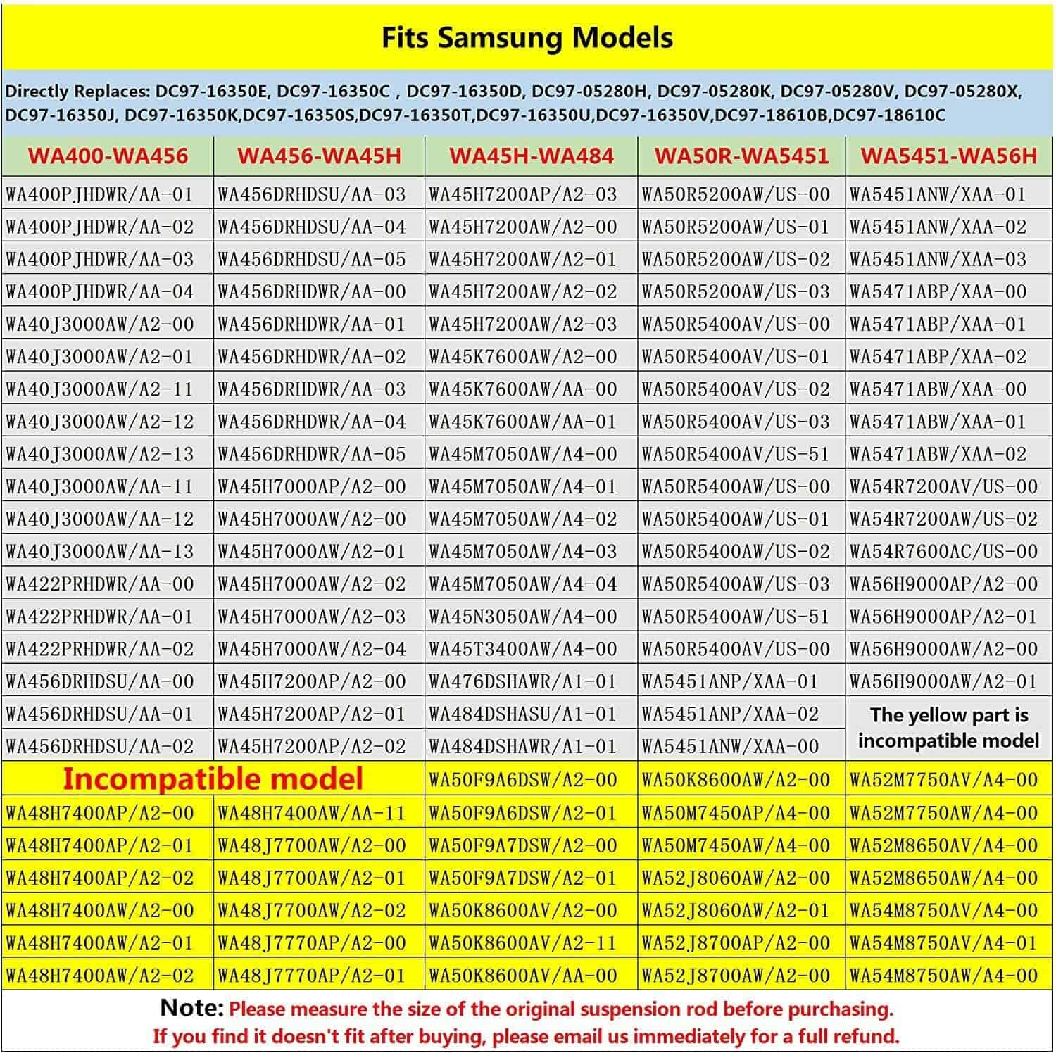 3. Se adapta a lavadoras de carga superior Samsung de las series WA400, WA40J, WA456, WA45H y WA45M: WA400PJHDWR/AA, WA40J3000AW/AA, WA422PRHDWR/AA, WA456DRHDSU/AA, WA456DRHDWR/AA, WA45H7000AP/A2, WA45H7000AW/A2, WA45H7200AP/A2, WA45H7200AW/A2, WA45K7600AW/A2, WA45K7600AW/AA, WA45M7050AW/A4, WA45N3050AW/A4, WA45T3400AW/A4, WA476DSHAWR/A1, WA484DSHASU/A1, WA484DSHAWR/A1, WA50R5200AW/US, WA50R5400AV/US, WA50R5400AW/US, WA5451ANP/XAA, WA5451ANW/XAA, y más.