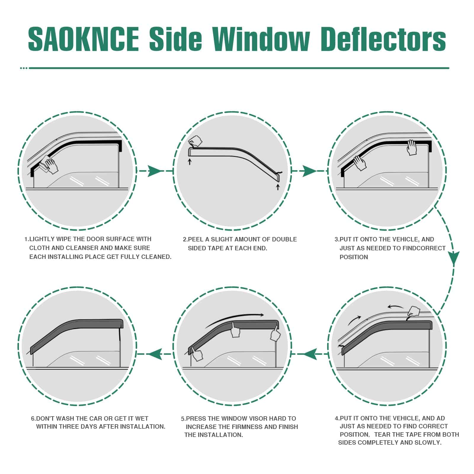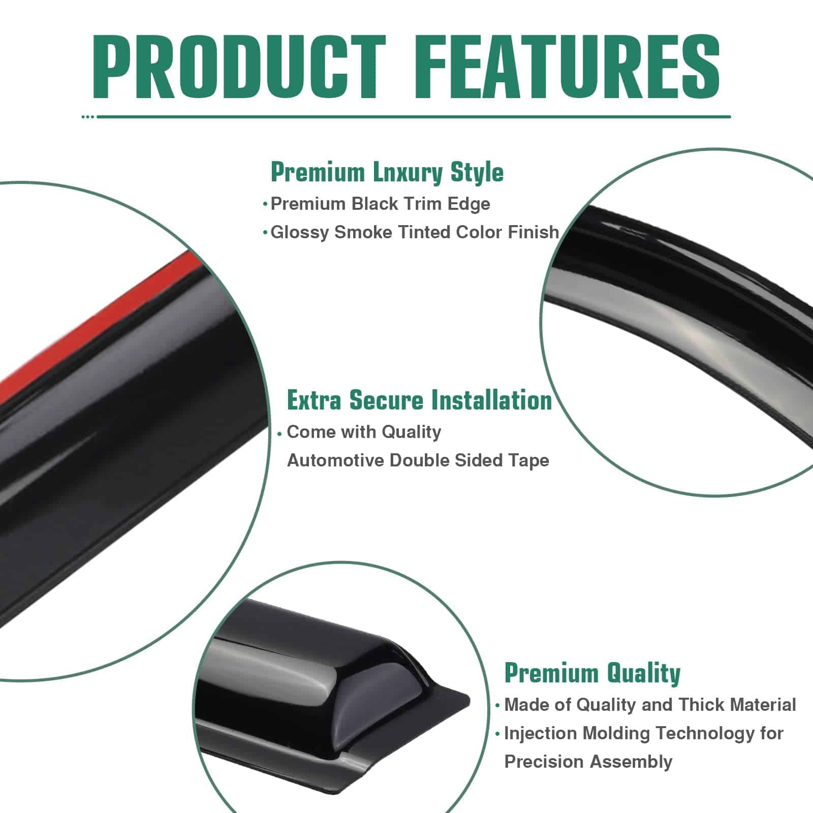 3. :Cada visera de ventana de montaje exterior viene con cinta adhesiva doble cara 3M que proporciona una instalación segura y duradera. No se necesitan herramientas ni instrucciones complicadas.