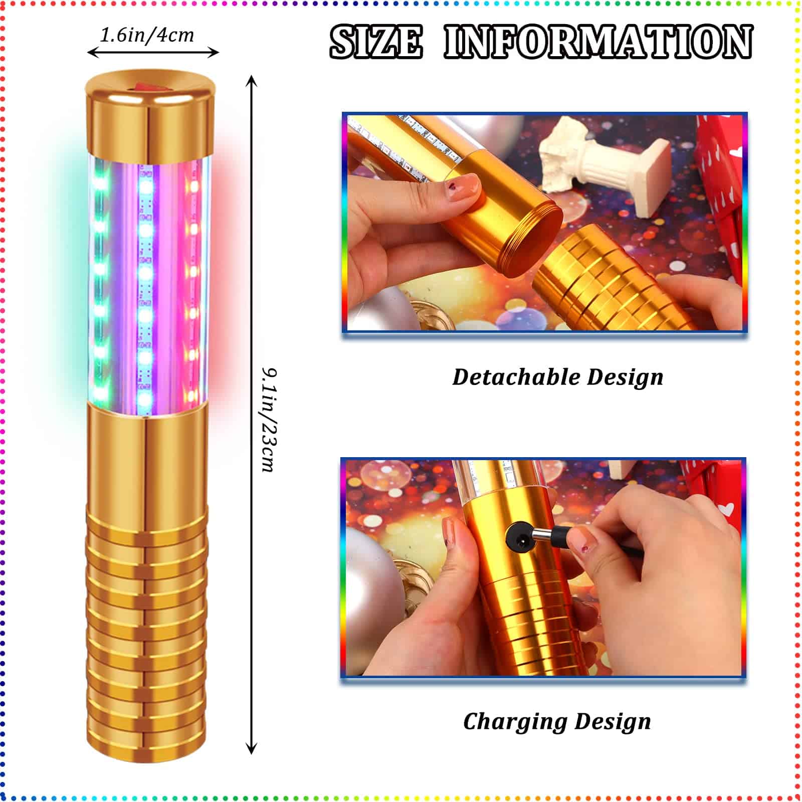 Características Destacadas Este batón de estroboscopio LED también puede servirte como un dispositivo de iluminación en tu vida diaria, portátil para llevar especialmente útil para aquellos que corren, escalan, acampan y pescan por la noche, para que puedan ver claramente el camino por delante. Especificaciones: – Material: Aleación de aluminio – Tamaño: Como se muestra en la imagen – Color: Como se muestra en la imagen Paquete Incluye: 4 luces de batón de estroboscopio LED, 4 x Cargadores Nota Cálida: 1. Por favor permita pequeños errores de tamaño debido a la medición manual. 2. Por favor contáctenos si tiene alguna pregunta sobre el producto, nos pondremos en contacto con usted lo antes posible y resolveremos los problemas de la manera que le satisfaga.