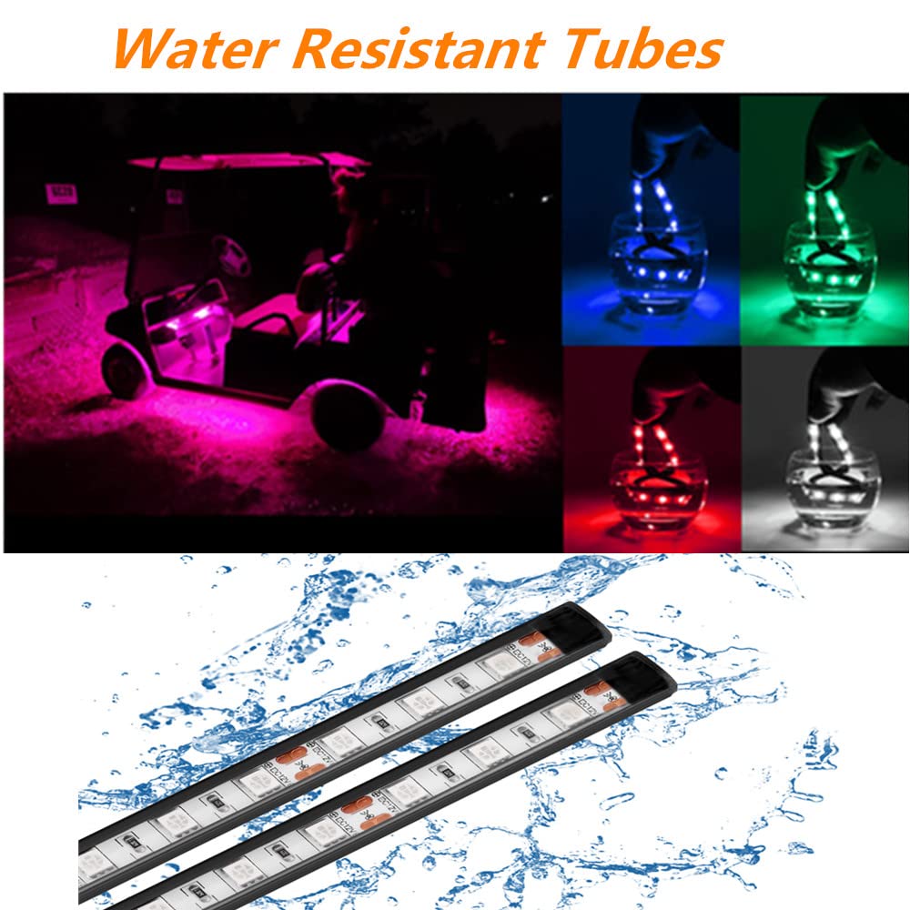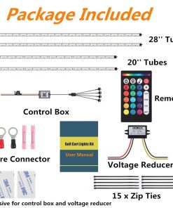 1. Kit de luces LED para carros de golf multicolor: Kit todo en uno, no se requieren accesorios adicionales, el kit está especializado para EZGO Club Car Yamaha y la mayoría de los carros de golf, resistente al agua IP67 para uso en exteriores, luz de decoración de ambiente de un millón de colores, luces de bajo del auto, perfecto para vestir tus carros de golf en fiestas y cualquier festival, como Halloween, Navidad, Año Nuevo, etc.