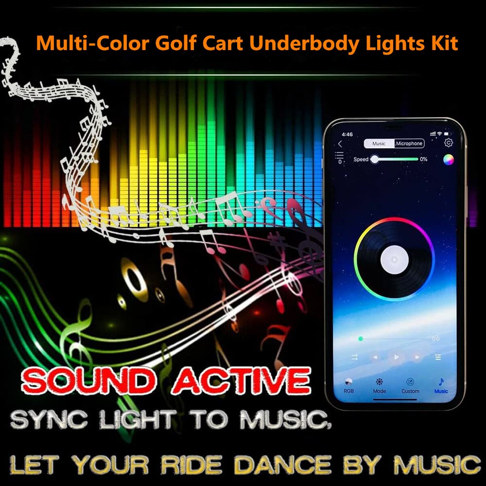 3. 2 Modos de control, múltiples efectos de iluminación: Gestiona las luces LED de tu carro de golf a través de la intuitiva aplicación mejorada o el control remoto RF de 24 teclas. Puedes elegir entre 16 millones de colores RGB diferentes y ajustar varios modos de iluminación (como fluir, saltar, correr, retroceder) para crear un carro de golf único y dinámicamente colorido, haz que tu carro de golf sea seguro y se vea genial.