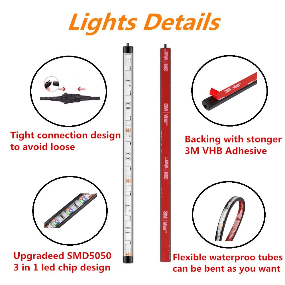 5. Instalación fácil: Kit completo de tira de luces LED que incluye 2 x 28 » y 2 x 20 » luces, reductor de voltaje de 17-66V, control remoto de 24 teclas, caja de sensor, manual de instrucciones, las luces LED tienen un adhesivo de respaldo más fuerte, puedes instalarlo en cualquier superficie seca y limpia, ahora incluimos 15 piezas extra de bridas, no tienes que preocuparte por que la tira se caiga, flexible para instalarla donde quieras.