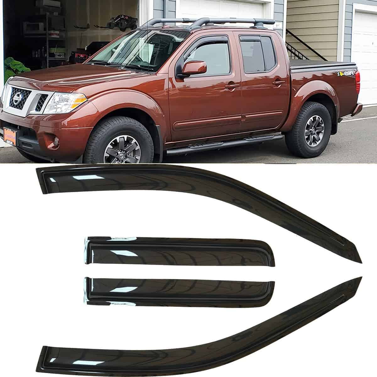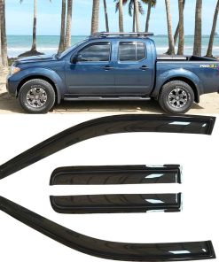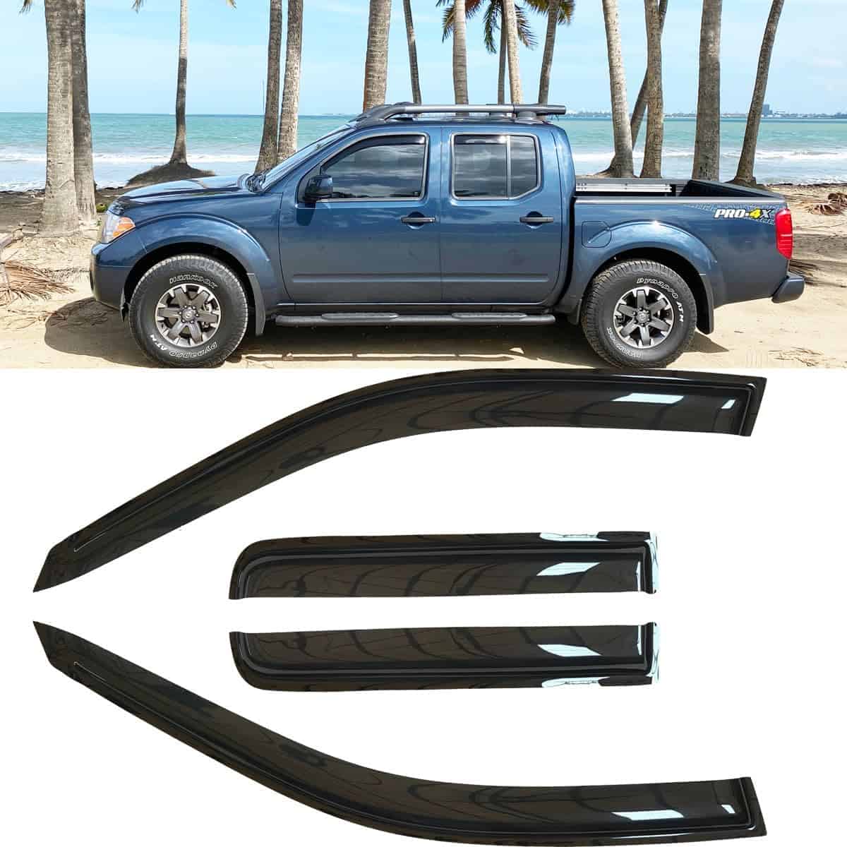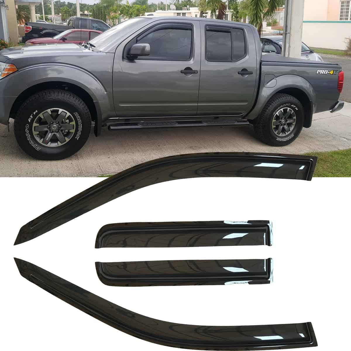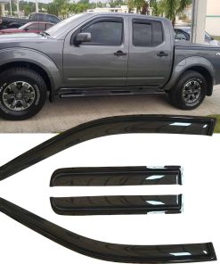 Shatterproof Window Wind Deflectors for Nissan Frontier 05-20: Protege su vehículo y mejora su comodidad al conducir con estos Deflectores de Viento para Ventanas resistentes y atractivos. Perfectos para Nissan Frontier Crew Cab 2005-2020 y Navara Crew Cab 2005-2022, estos visores de ventanas Dark Smoke aportan estilo y funcionalidad a su coche. Los deflectores están fabricados con acrílico reforzado de alta calidad que no se deforma, rompe o agrieta, garantizando durabilidad y fiabilidad. Además, el diseño aerodinámico y flexible en color humo oscuro agrega protección solar y mejora la estética de su vehículo. Disfrute de viajes más seguros y agradables con estos deflectores que reducen el ruido del viento y el empañamiento de las ventanas, lo que ayuda a mantener una visibilidad clara en todas las condiciones climáticas. La instalación es sencilla gracias al diseño de Pelar y Pegar con cinta adhesiva que no afecta el funcionamiento de las ventanas y se puede quitar fácilmente si es necesario. Convierta su vehículo en un lugar más confortable y seguro con estos Deflectores de Viento para Ventanas para Nissan Frontier.