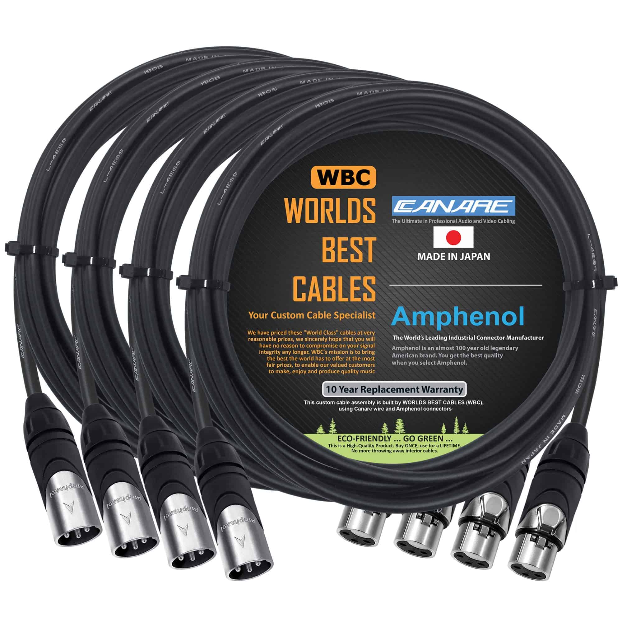 4 Unidades – Hechas a medida – 10 Pies Canare L-4E6S, Star Quad, Cables de Micrófono Balanceados Blindados (blindaje trenzado e aislamiento de polietileno) terminados con Conectores XLR Macho de Plata Amphenol AX3M y Conectores XLR Hembra de Plata Amphenol AX3F (esta venta es por 4 cables, cada cable tiene una longitud de 10 pies).