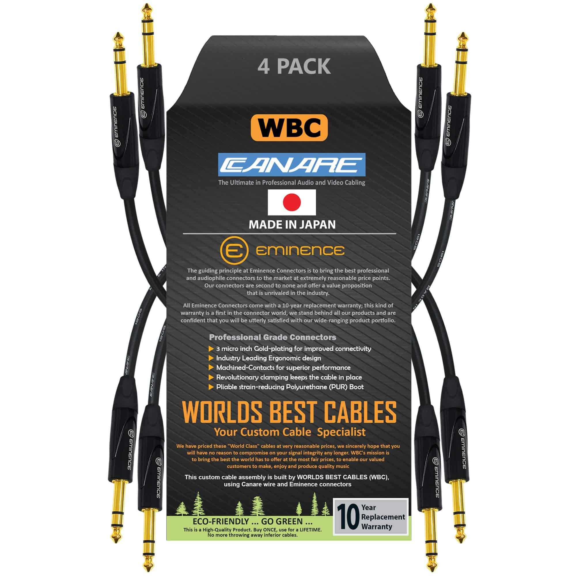 4 Unidades – 6 Pulgadas – Cable de parche TRS macho equilibrado de cuádruple estrella Canare L-4E6S, blindado (blindaje trenzado e aislamiento de polietileno) terminado con conectores macho estéreo TRS Eminence E502 Gold (esta venta es por 4 cables, cada cable tiene 6 pulgadas de longitud) – HECHO A MEDIDA por WORLDS BEST CABLES. En WBC siempre realizamos ensamblajes de cables personalizados de clase mundial utilizando muchas de las principales marcas de cables y conectores. Si no puedes encontrar la longitud y tipo de cable que buscas, no dudes en contactarnos, nos esforzaremos por armar el cable requerido para ti.