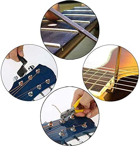 Uso: Este kit de herramientas de reparación de guitarra puede ayudarte a cambiar las cuerdas, ajustar la afinación, ajustar el movimiento, verificar la altura de las cuerdas, etc., con el fin de mantener el instrumento con un buen rendimiento.