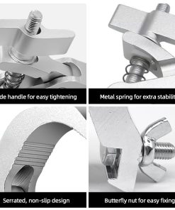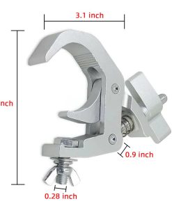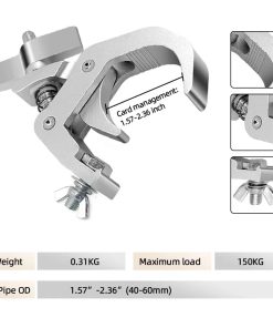 4Pack Ganchos de Abrazadera de Iluminación de Escenario Pesados, Abrazaderas de Truss de Aluminio Premium Pro para Uso en Trusses de 1.57-2.36 pulgadas, Capacidad de Peso de 330 lb para Uso en Equipos de Iluminación de Escenario Móvil. Material de las abrazaderas de iluminación de escenario: Aleación de aluminio de alta calidad 6061, también a través de un proceso especial para fortalecer la dureza, pulido de superficies, sin rebabas. Adecuado para tamaño de trusses: Adecuado para tubos cuadrados o redondos con un diámetro exterior de 1.57-2.36″ (40-60mm), capacidad de carga de 150kg/330 lbs. Diseño de dientes antideslizantes: El diseño de dientes antideslizantes de la abrazadera aumenta en gran medida la fijación entre la abrazadera y el tubo, haciéndolo más seguro y firme. Lugares Aplicables: Adecuado para cabezales móviles, luces PAR LED, luces de efecto LED y otras luminarias de escenario. Consejos Cálidos: Considerando la seguridad, al menos elija las abrazaderas de iluminación de escenario de carga que sean tres veces más grandes que el peso de las luminarias mismas.