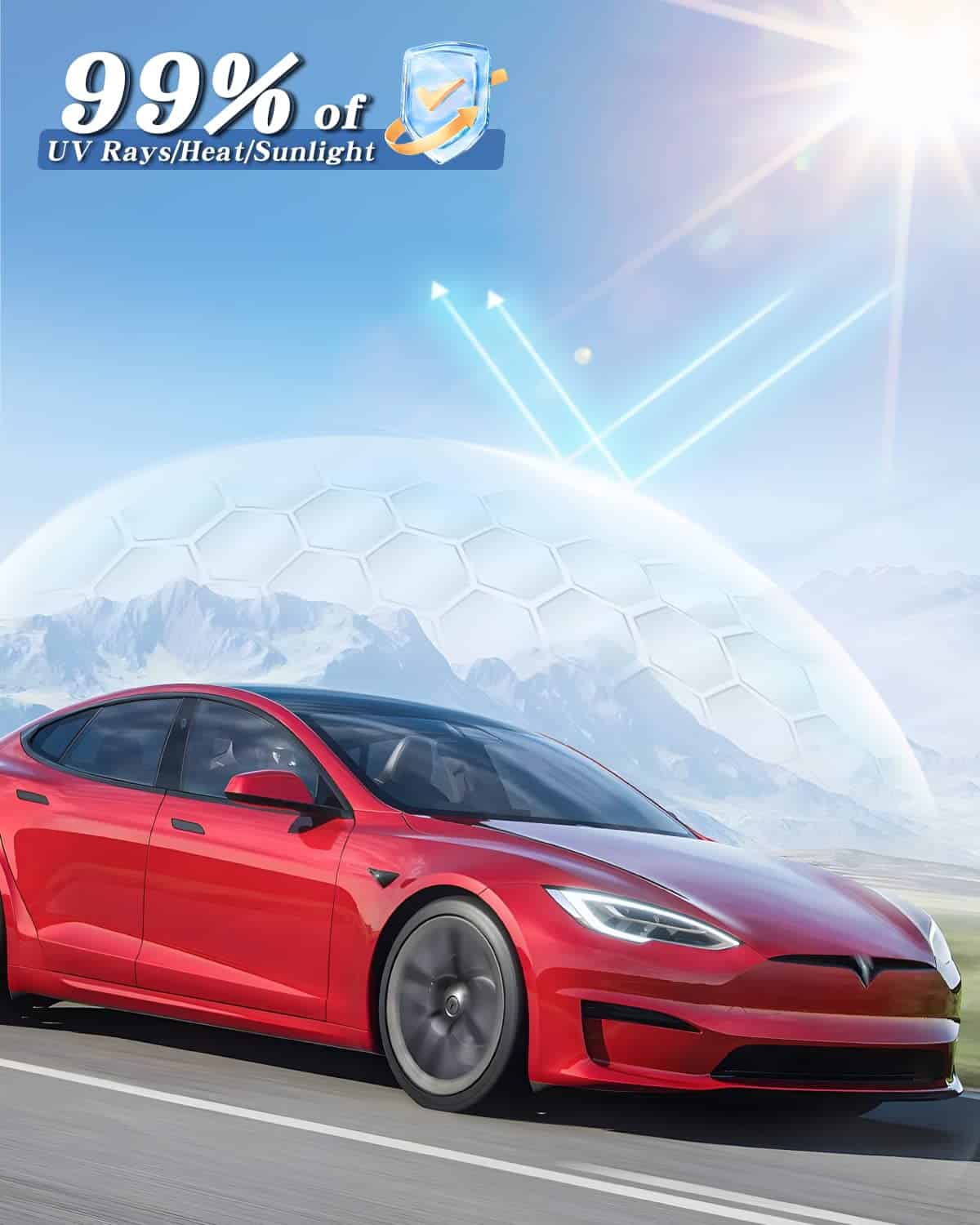 El 2 en 1 parasol de crystal de hielo para techo de Tesla Model 3 tiene un diseño mejorado para 2023, que integra la capa de recubrimiento de puntos plateados de plata y la capa de visera solar nano de alta densidad en un solo cuerpo. Especialmente diseñado para Tesla Model 3 2021-2023. Diseño personalizado según el tamaño del coche original, adecuado para el techo de vidrio del Tesla Model 3 2021-2023. El parasol de vidrio para el techo del Model 3 está hecho de materiales poliméricos, seis capas de materiales barrera, capa resistente al calor plateada; capa de disipación de calor de enfriamiento rápido; capa de absorción de calor a temperatura constante para absorber el calor residual; capa de transición sin costuras que transmite el calor residual; capa de radiación de aislamiento que bloquea los rayos ultravioleta; capa de aislamiento de nano alta densidad, aísla eficazmente el calor, mantiene tu coche fresco y te proporciona un espacio confortable. El parasol para techo de Tesla Model 3 está hecho de material de nano crystal de hielo de alta densidad, seis capas de materiales barrera, denso y engrosado sin espacios, sin olor al exponerse a altas temperaturas, e aísla eficazmente la transmisión de energía térmica. El marco de aleación de acero de alto manganeso en el borde del parasol del techo de Tesla ha sido tratado térmicamente para mejorar su rendimiento, y no se deforma después de un uso a largo plazo. La instalación y almacenamiento del parasol de techo para Tesla Model 3 es fácil: solo necesita instalarlo en el techo del Tesla Model 3 con el clip, y luego colocar el parasol del techo del Model 3 en el marco del techo solar y insertarlo en la ranura en el borde del techo solar. Ofrecemos una bolsa de almacenamiento para un fácil almacenamiento. Servicio posventa: Si recibes nuestro parasol para techo de Tesla Model 3 y tienes algún problema, como un color incorrecto, una serie de productos incorrecta, asegúrate de contactarnos lo antes posible, te ayudaremos a resolver el problema. (El paquete de parasol para techo de vidrio de Tesla Model 3 incluye: 1 parasol delantero para techo, 1 parasol trasero para techo, 12 clips, 2 parasoles para ventanas triangulares, 1 bolsa de almacenamiento, 1 manual de instrucciones).