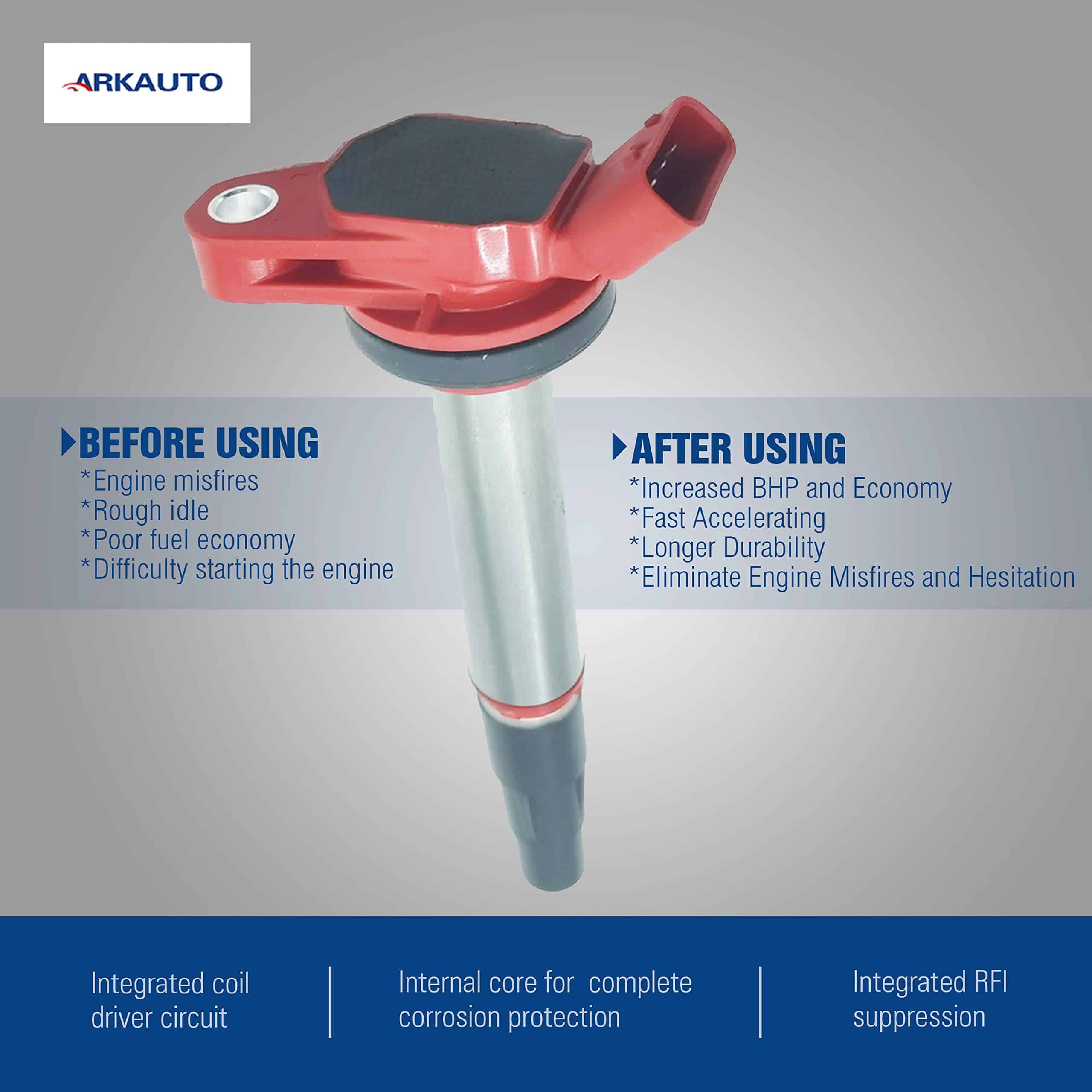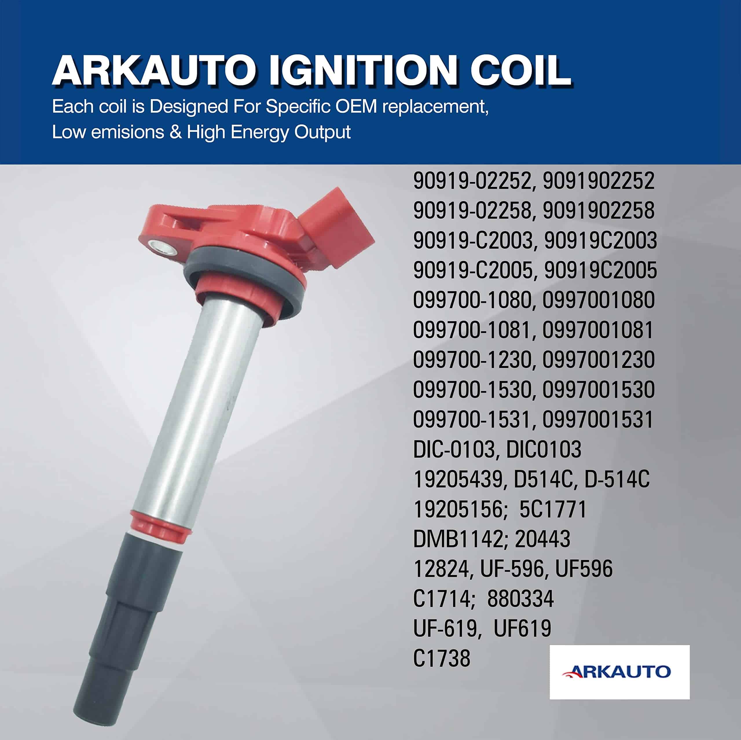 2. VENTAJA – Las bobinas de encendido ARKAUTO están diseñadas según los tipos originales OE, las cuales pueden reemplazar perfectamente sus bobinas defectuosas originales y funcionar como las originales. Esta bobina es un reemplazo para OE: 90919-02252, 9091902252, 90919-02258, 9091902258, 90919-C2003, 90919C2003, UF-596, UF596, UF-619, UF619, C1738. Los compradores deben comparar cuidadosamente el OE con las piezas originales de sus autos antes de ordenar para evitar comprar una parte incorrecta y causar una pérdida innecesaria.