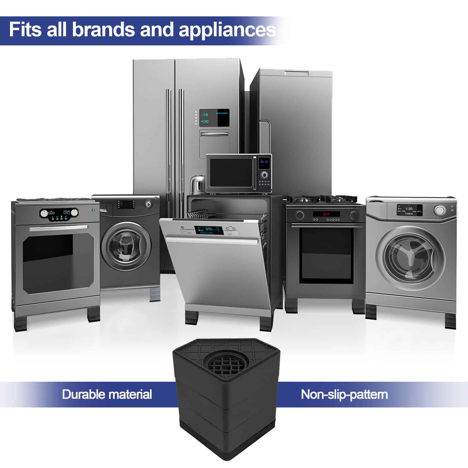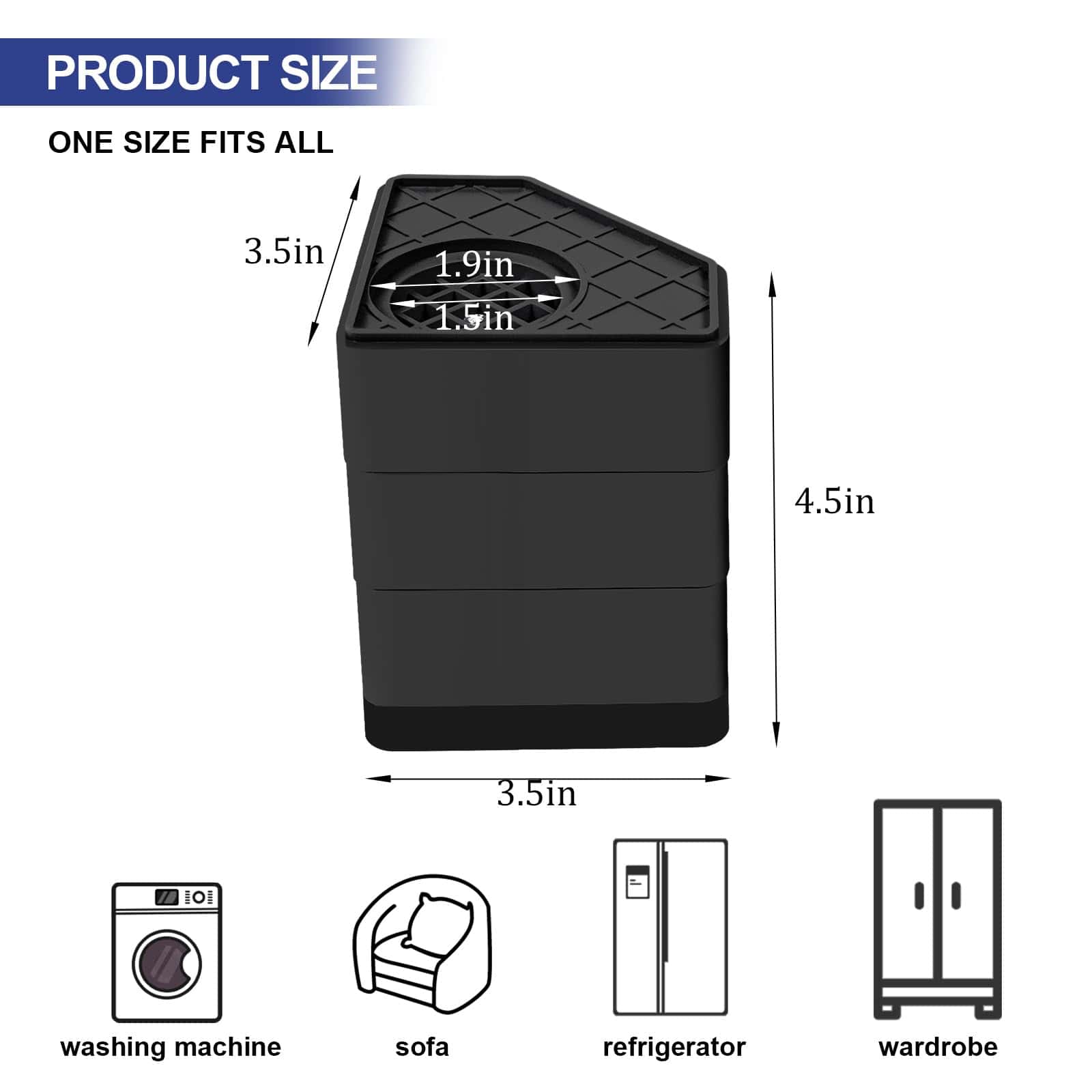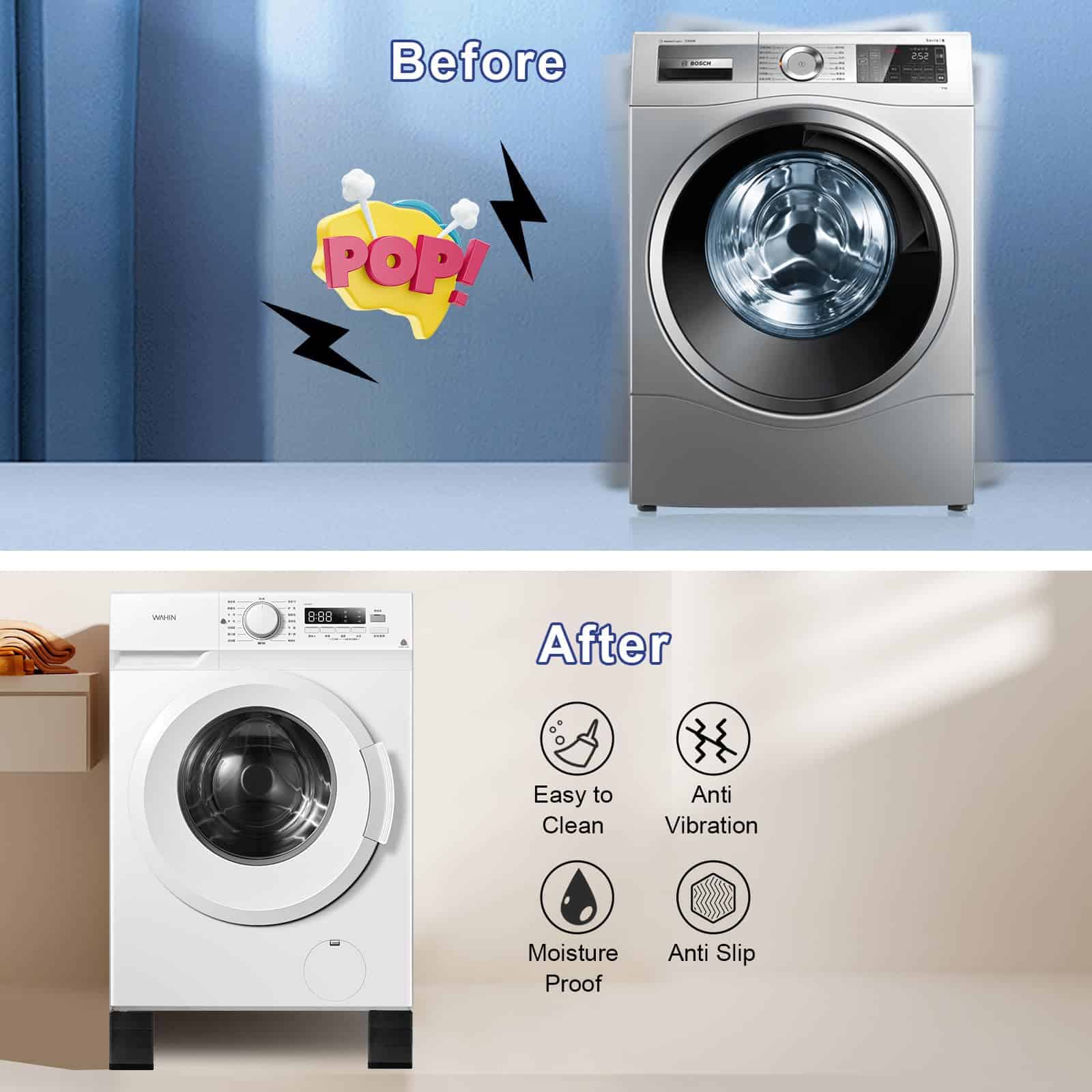4. Amplia Aplicación: Las almohadillas de goma antivibración de soporte de la lavadora para shock y cancelación de ruido se pueden utilizar no solo para lavadoras y secadoras, sino también para electrodomésticos, camas, sofás, patas de mesa, patas de silla, patas de armario, patas de sofá, aumentar la altura del electrodoméstico y los muebles para evitar la humedad y facilitar la limpieza.