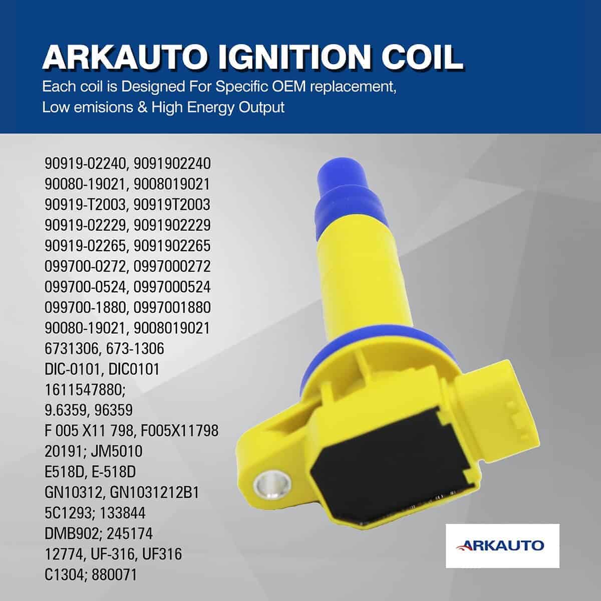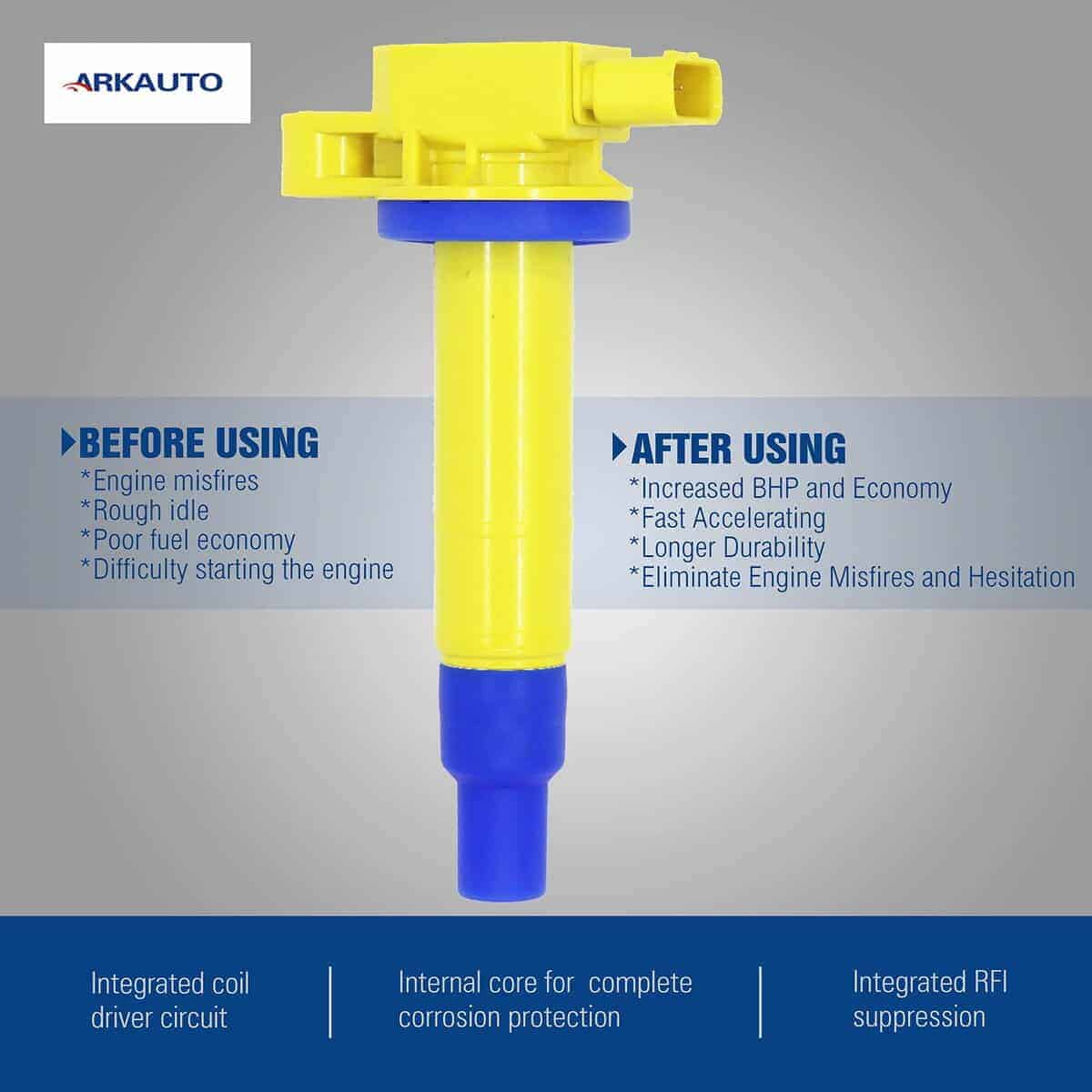 ARKAUTO Ignition coils están siempre hechos con cobre de alta calidad, diseñados para una aplicación específica y probados en carretera. Por favor, revise la información a continuación cuidadosamente para asegurarse de que esta pieza sea compatible con su vehículo. Reduces los problemas comunes de la bobina de encendido, como; arranque no/duro, tiempo de arranque largo, fallos de encendido, falta de potencia, cambios de marcha inconsistentes, ensuciamiento de bujías, fallo prematuro del convertidor catalítico, mala economía de combustible, iluminación de la luz de comprobación del motor. Garantía limitada de 1 año – Por favor, use see if this part is compatible with your vehicle.