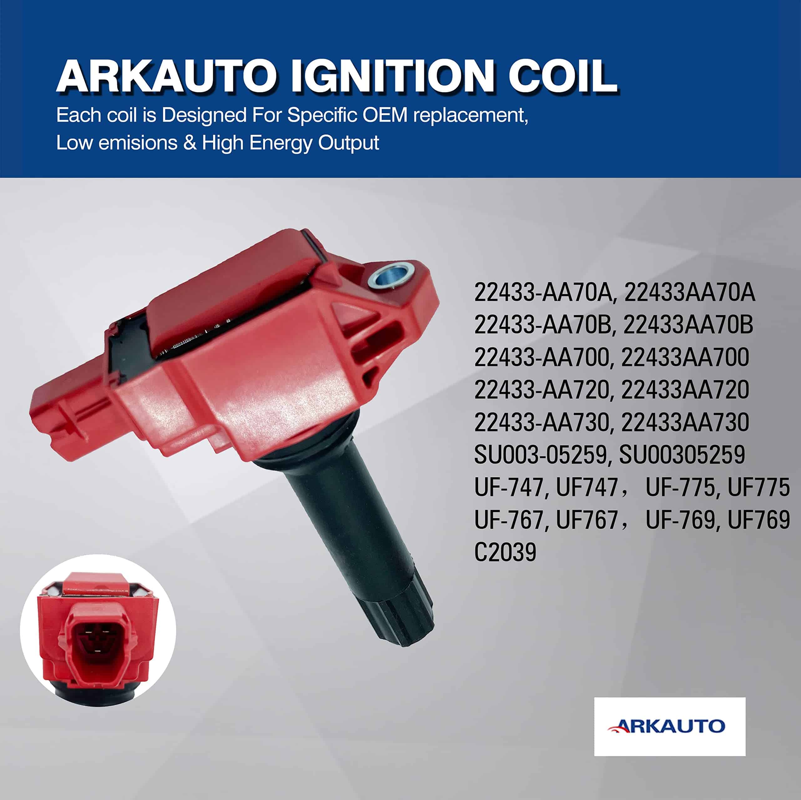 ARKAUTO ignition coils están diseñados de acuerdo con los tipos OE originales, los cuales pueden reemplazar perfectamente sus bobinas originales defectuosas y funcionar como las originales. Esta bobina es un reemplazo para OE: 22433-AA70A, 22433AA70B, 22433-AA700, 22433-AA720, 22433-AA730, SU003-05259, SU00305259, UF-747, UF747 UF-775, UF775, UF-767, UF767 UF-769, UF769, C2039. Los compradores deben comparar el OE con sus autos originales cuidadosamente antes de ordenar para evitar comprar una parte incorrecta y causar una pérdida innecesaria. Compatible con 86 Scion FR-S BRZ Crosstrek Forester Legacy Outback WRX XV 2.0 2.0T 2.5 H4 FB20 FB25 FA20. Reduce problemas comunes de las bobinas de encendido como: dificultad para arrancar, tiempo de arranque largo, fallos, falta de potencia, cambios de transmisión inconsistentes, ensuciamiento de bujías, fallo prematuro del convertidor catalítico, mala economía de combustible, iluminación de la luz de verificación del motor. Garantía limitada de 1 año – Por favor, verifique si esta parte es compatible con su vehículo.