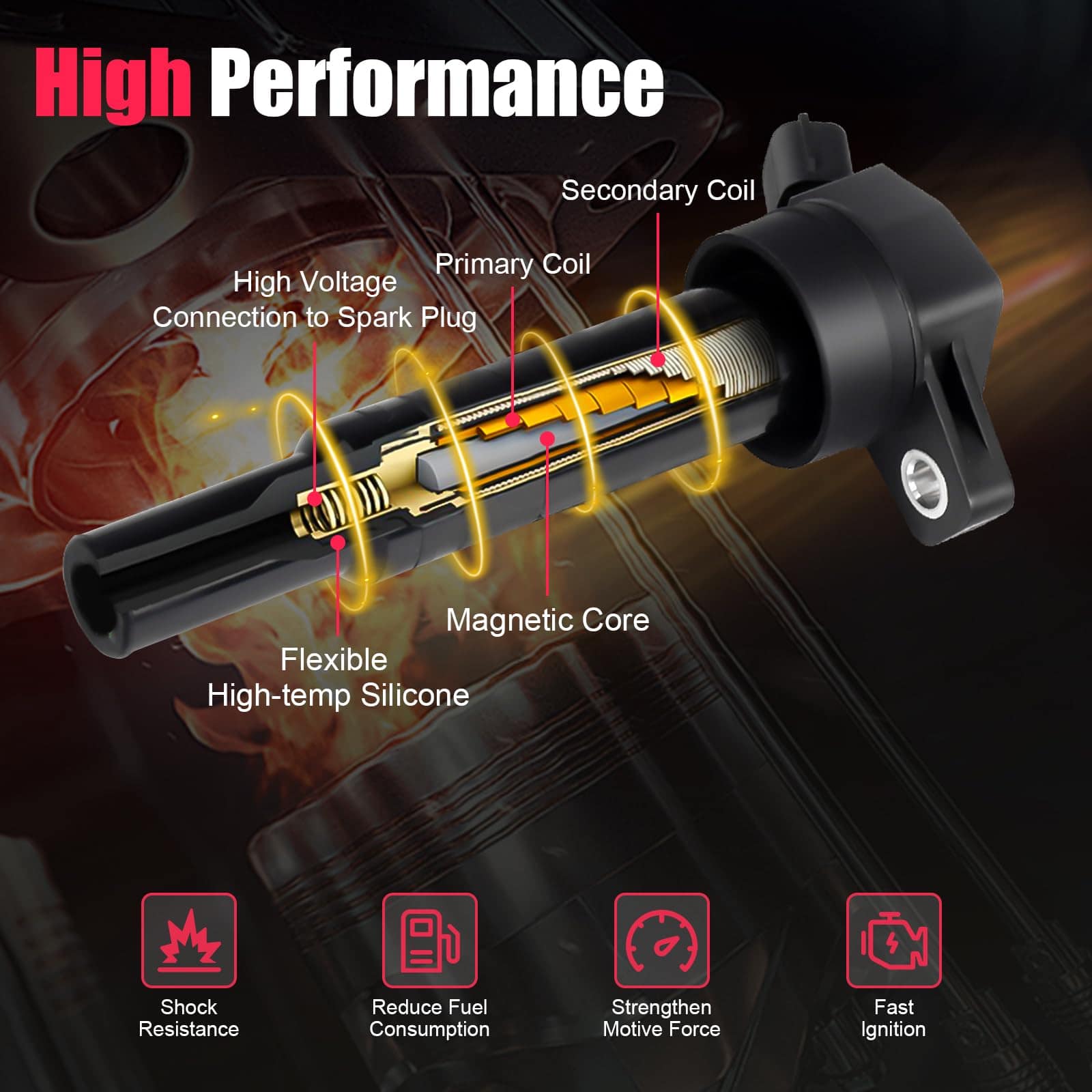4. Función Excelente: Después de aproximadamente 50,000 kilómetros de conducción, es posible que sus bobinas de encendido comiencen a mostrar signos de envejecimiento, lo que podría provocar fallos en el motor, ralentí áspero, disminución de la potencia y mala economía de combustible. Nuestras bobinas de encendido meticulosamente diseñadas y mejoradas están diseñadas para superar los estándares OEM, garantizando una instalación sin esfuerzo y mejorando drásticamente el rendimiento. Experimente capacidades excepcionales de arranque en frío y un funcionamiento del motor más suave.