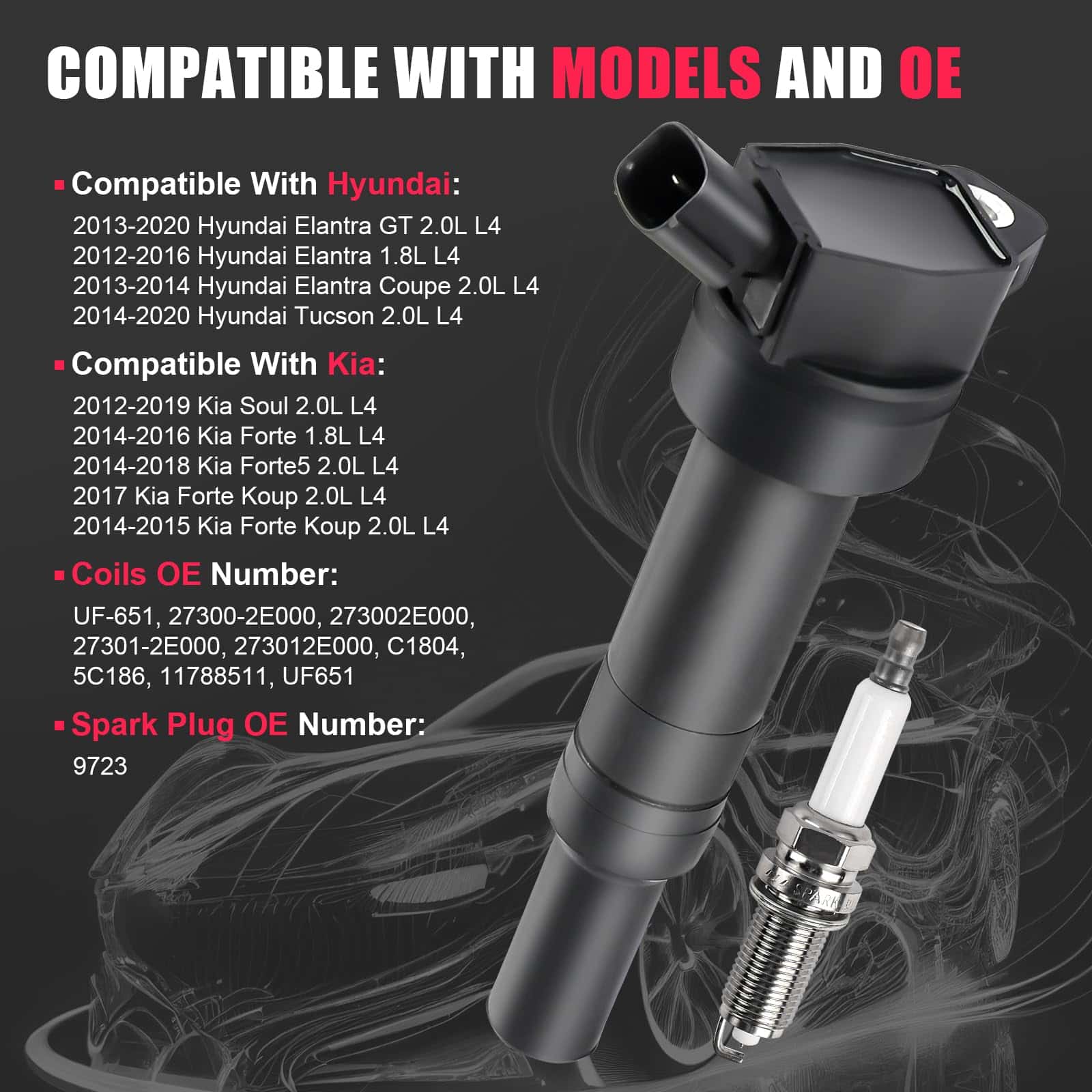 1. Compatible con: Bobina de encendido y bujía para: 2012 2013 2014 2015 2016 Hyundai Elantra 1.8L L4 | 2013-2020 Hyundai Elantra GT 2.0L L4 | 2013-2014 Hyundai Elantra Coupe 2.0L L4 | 2014-2020 Hyundai Tucson 2.0L L4 | 2012-2019 Kia Soul 2.0L L4 | 2014-2016 Kia Forte 1.8L L4 etc. Para una comprensión más detallada, consulte la Descripción del Producto.