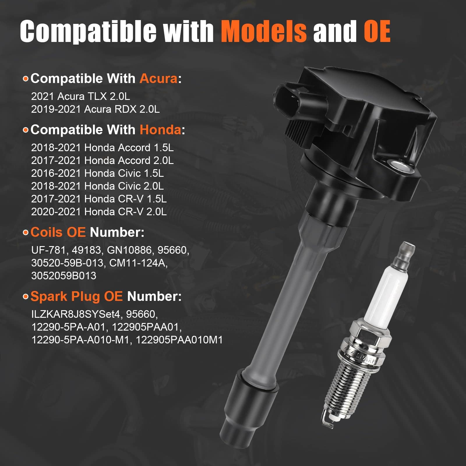 1. Modelos de Vehículos Compatibles: Bobinas de encendido y Bujía de Iridio Ajuste para Modelos de Honda: Accord | Civic | CR-V, Ajuste para Modelos de Acura: TLX | RDX. Para modelos aplicables detallados, consulte la página y la imagen principal. Coil pack Reemplaza UF-781, 49183, GN10886, 95660, 30520-59B-013, CM11-124A, 3052059B013.