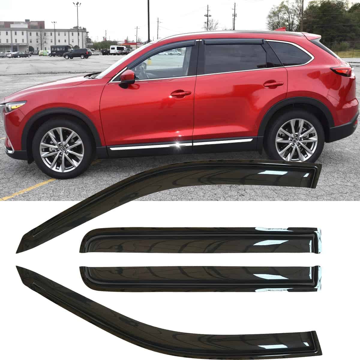 1. Ajuste: Deflector de Viento para Ventanas del lado del Pasajero y Conductor diseñado para Mazda CX9 del 2016 al 2021. 2. INCLUYE: 4 Piezas de Viseras para Ventanas con Protección Solar (Instrucciones de instalación incluidas, Por favor lea las instrucciones del Usuario antes de la instalación). 3. DURABLE Y ELEGANTE: Nuestro Deflector de Ventilación está hecho con acrílico reforzado de alta calidad y resistente, que no se doblará, romperá ni agrietará. El diseño flexible y estilizado de color humo oscuro es elegido como el mejor para la protección solar, además de mejorar la apariencia de su automóvil, y se adapta personalizado a vehículos específicos por Marca, Modelo y Año. 4. HACE QUE LOS VIAJES SEAN AGRADECEBLES Y SEGUROS: Puede conducir con comodidad con nuestros deflectores de lluvia, sin preocuparse por el ruido del viento, la nieve fría, las molestas salpicaduras de lluvia o el sol ardiente. Ayudan a mejorar la ventilación para reducir el empañamiento de las ventanas y mantener la vista clara para hacer que los paseos sean seguros. 5. FÁCIL INSTALACIÓN: Diseño Directo a Pegar, fácil instalación sin cortes ni perforaciones que no afectará la apariencia de su automóvil (Sin Cortes y Sin Perforaciones).
