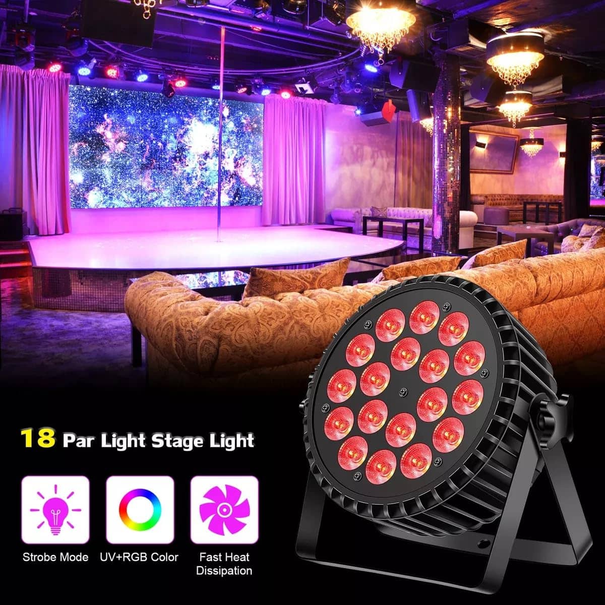 RGBWA+UV 6-en-1 Colores de Iluminación Esta nueva y mejorada luz de par LED profesional ultra brillante de 18LED utiliza cuentas de luz RGBWA+UV 6-en-1 HD, con la adición de colores ámbar y UV. Puede producir hasta 9 colores diferentes. Los colores emitidos abarcan todo el espectro, con tonos puros y vibrantes, lo que permite crear efectos de iluminación aún más diversos. Cambio de color y atenuación de la luz están disponibles, lo que podría satisfacer su necesidad de escenario. Calidad Superior y Construcción Perfecta La alta calidad es una característica destacada de esta luz de escenario LED. Fabricada con un recubrimiento de aleación de aluminio-hierro, cuenta con una fuerte disipación de calor, otorgándole una vida útil de más de 100,000 horas. Viene con ventajas como bajo consumo de energía, alta eficiencia energética, salida estable de la fuente de luz y durabilidad. Admite Varios Modos de Control Esta luz de par DJ soporta control DMX (6H/10CH), control de sonido, modo automático y modo esclavo-maestro. La pantalla de visualización digital inteligente en la parte trasera facilita el ajuste de diferentes modos y es fácil de operar. También se puede conectar en cadena para el suministro de energía, permitiendo que múltiples luces se interconecten y se usen simultáneamente. Es una luz de escenario de alta potencia perfecta. Calidad Superior y Construcción Perfecta La alta calidad es una característica destacada de esta luz de escenario LED. Fabricada con un recubrimiento de aleación de aluminio-hierro, cuenta con una fuerte disipación de calor, otorgándole una vida útil de más de 100,000 horas. Viene con ventajas como bajo consumo de energía, alta eficiencia energética, salida estable de la fuente de luz y durabilidad. Adecuado para Varios Escenarios El empaque incluye dos soportes, lo que permite una fácil instalación en armazones, paredes o pisos. Esta luz de Par Can de alta potencia es adecuada para cualquier reunión festiva, Halloween, escenarios, bodas, DJs, fiestas, bares, iglesias, eventos en vivo y más.