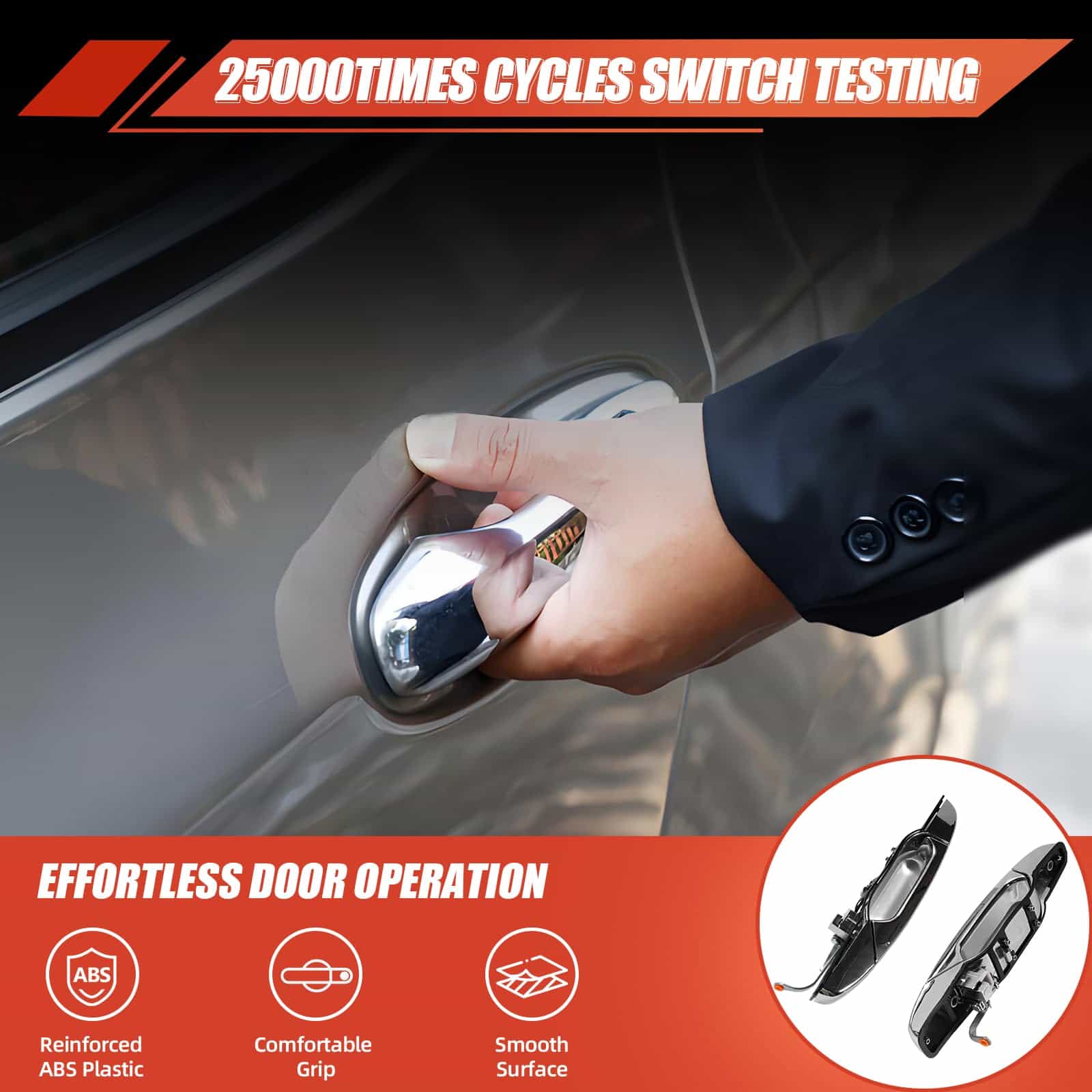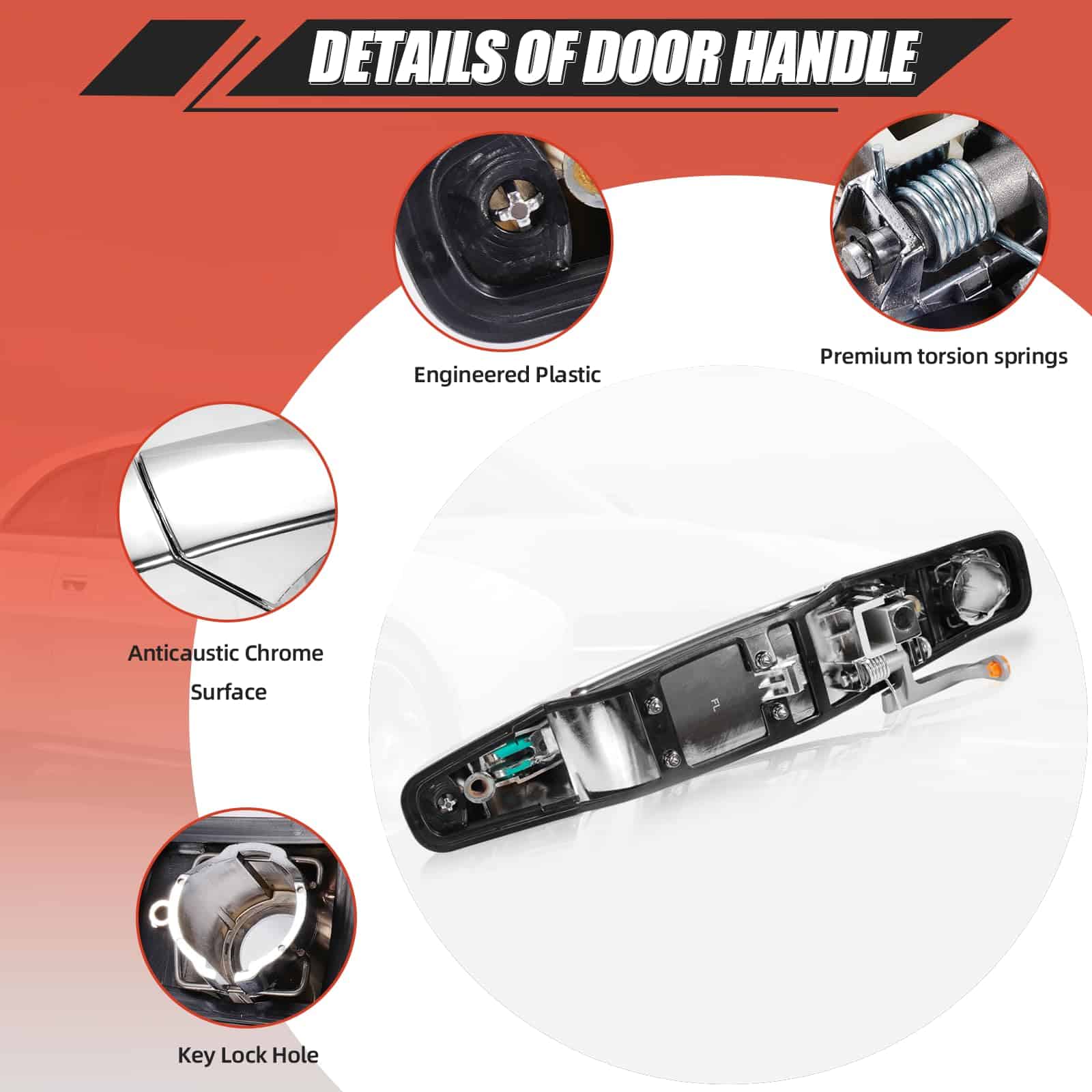 3. Ajuste y calidad OEM: Las manijas de puerta exteriores delanteras y traseras, lado del conductor y del pasajero están fabricadas con materiales duraderos de plástico y cromo. Con fabricación precisa y pruebas rigurosas, estas manijas garantizan un rendimiento duradero y una funcionalidad confiable, coincidiendo con el ajuste y acabado OEM original para un reemplazo perfecto.