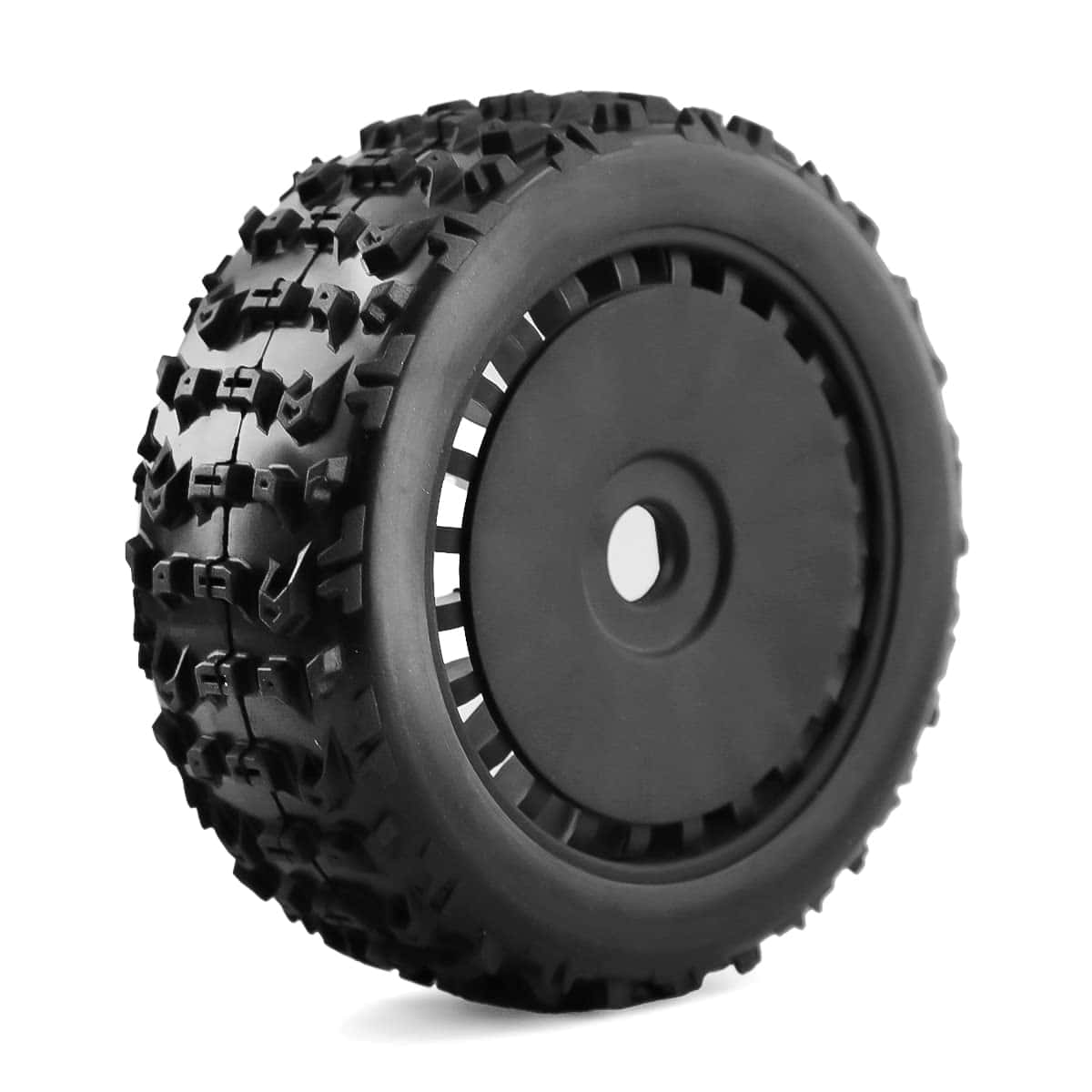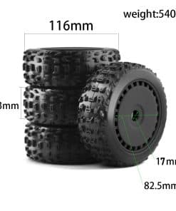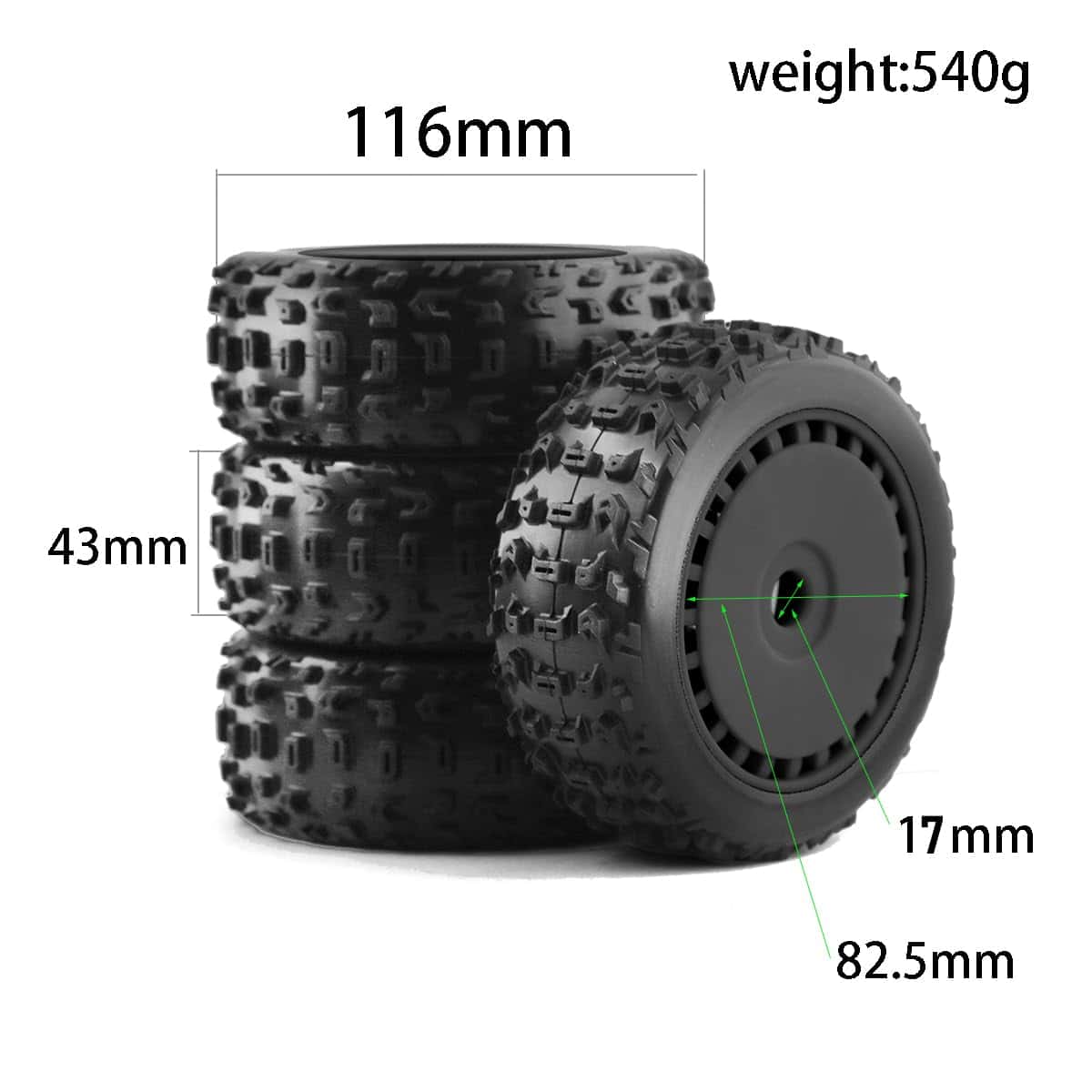 Diámetro del talón de la rueda: 3.3″ (83mm), Ancho: 1.7″ (44mm), Tamaño del hexágono de la rueda: 17mm, Diámetro total: 4.6″ (117mm);