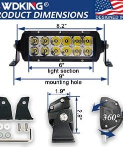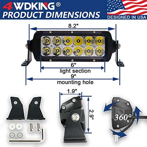 4WDKING de los Estados Unidos, con sede en California. Desde 2008, 4WDKING ha sorprendido a los entusiastas del automóvil entregando iluminación LED todoterreno de alta calidad que fusiona la asequibilidad con un diseño innovador. ¿Por qué elegirnos? Libre de Radios: Sin radiación e interferencia para el equipo electrónico del vehículo. Diseño sin ruido de viento reduce la resistencia a la carrera del automóvil. Soporte de Montaje de 360 grados: Cambiando la dirección del haz de luz más fácil. A través de pruebas severas, UV, Vibración, Anti-interferencia, Niebla salina, Alta y baja temperatura, Impacto de bola de caída, etc. Aplicaciones: -Iluminación de vehículos todoterreno: La Barra de Luz LED puede aplicarse ampliamente a la Pick-Up Pesada de Texas, ATV, Motocicleta de Arizona, 4×4, UTV, SUV de Nueva York, RV, Wagon, Furgoneta, Camper, Buggy de carretera, Rail de arena, Tren, Autobús, etc. -Iluminación Marina: Esta Luz Cuadrada se puede instalar en el Jon boat de pato de Florida, yate, skiff de Wisconsin, barra, carguero y barco para mejorar el brillo iluminador de la travesía. -Iluminación Industrial, Agrícola y de Equipos & Iluminación Doméstica: Se adapta perfectamente a Remolques, Montacargas, Excavadoras, Topadoras, Rodillos de carretera, Grúas, Tractores de Missouri, Cosechadora, Sembradora, Cortacésped de giro cero de Utah, Quitanieves de Illinois, Carro de golf, Motonieve de Ohio, Camión de bomberos, Vehículo de rescate, Camping, Minería de Georgia, Construcción e iluminación al aire libre. Especificaciones: – Haz: Patrón Combo. Spot&inundación – Voltaje de Entrada: 9-36VDC (los vehículos de 24V necesitan cambiar el relé de 24V) – Temperatura de Trabajo: -40~185 – Temperatura del Color: Blanco Puro 6500K – Material: Perfil de aluminio, LED alemanes Paquete Incluido: 2x Barra de Luz Off-Road de 6″ Doble Fila, Soportes de Montaje y Set de Tornillos NOTA: Solo para uso fuera de carretera. No utilizar si se requiere DOT. Garantía de 12 meses.