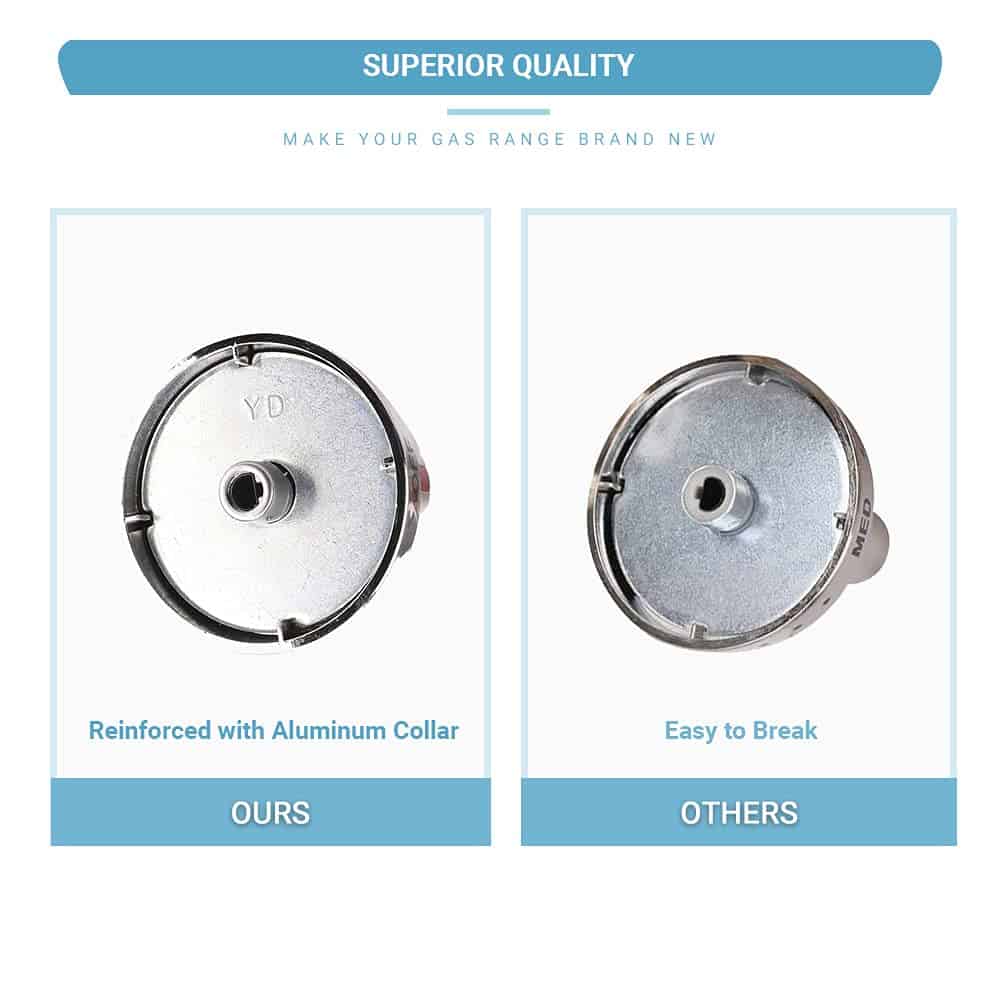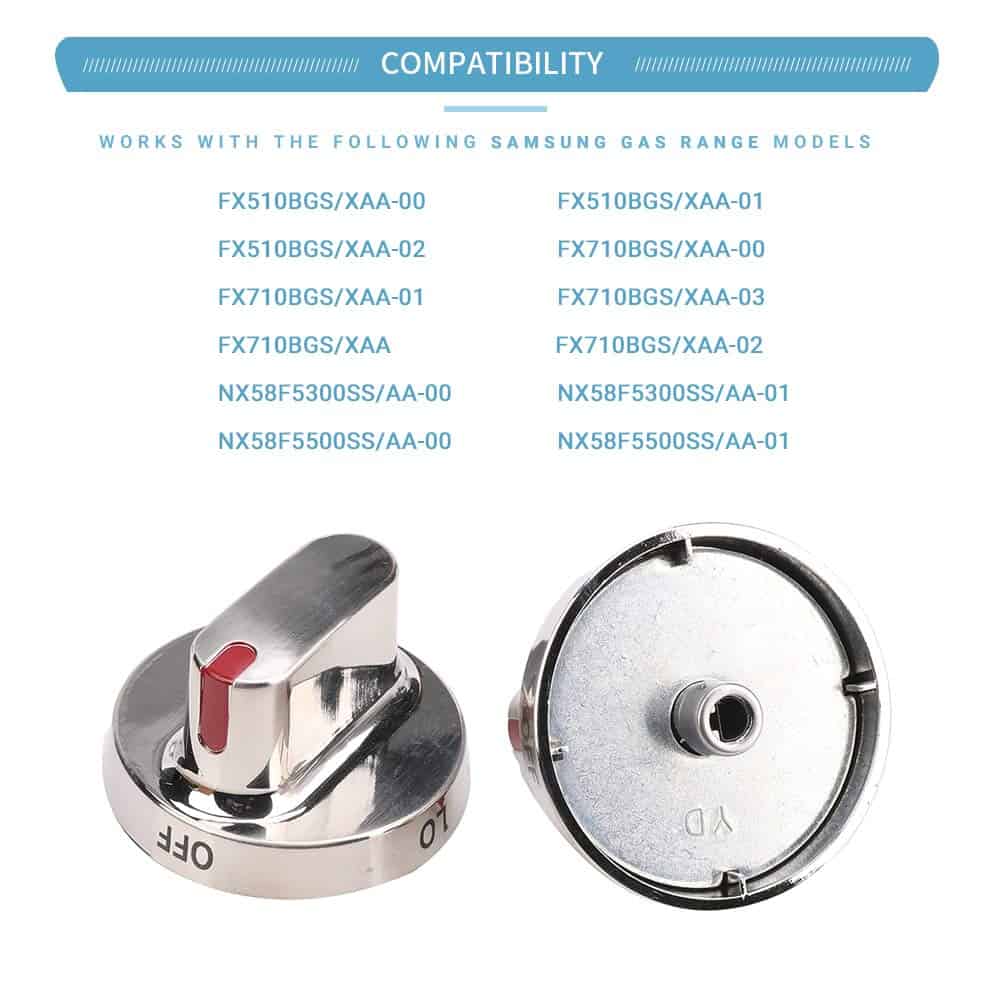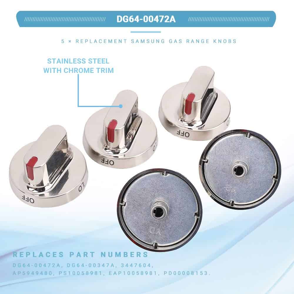 1. REPUESTO IDEAL: ¿Necesitas 5 nuevas Perillas de Estufa DG64-00472A que coincidan con las originales, por mucho menos que ir al concesionario? Este repuesto de perilla de estufa fue diseñado específicamente para verse y funcionar igual que la perilla de quemador original en las perillas de estufa Samsung. Aunque no es una perilla de rango Samsung genuina, es un reemplazo directo y aparecerá, encajará y funcionará como la parte de fábrica.