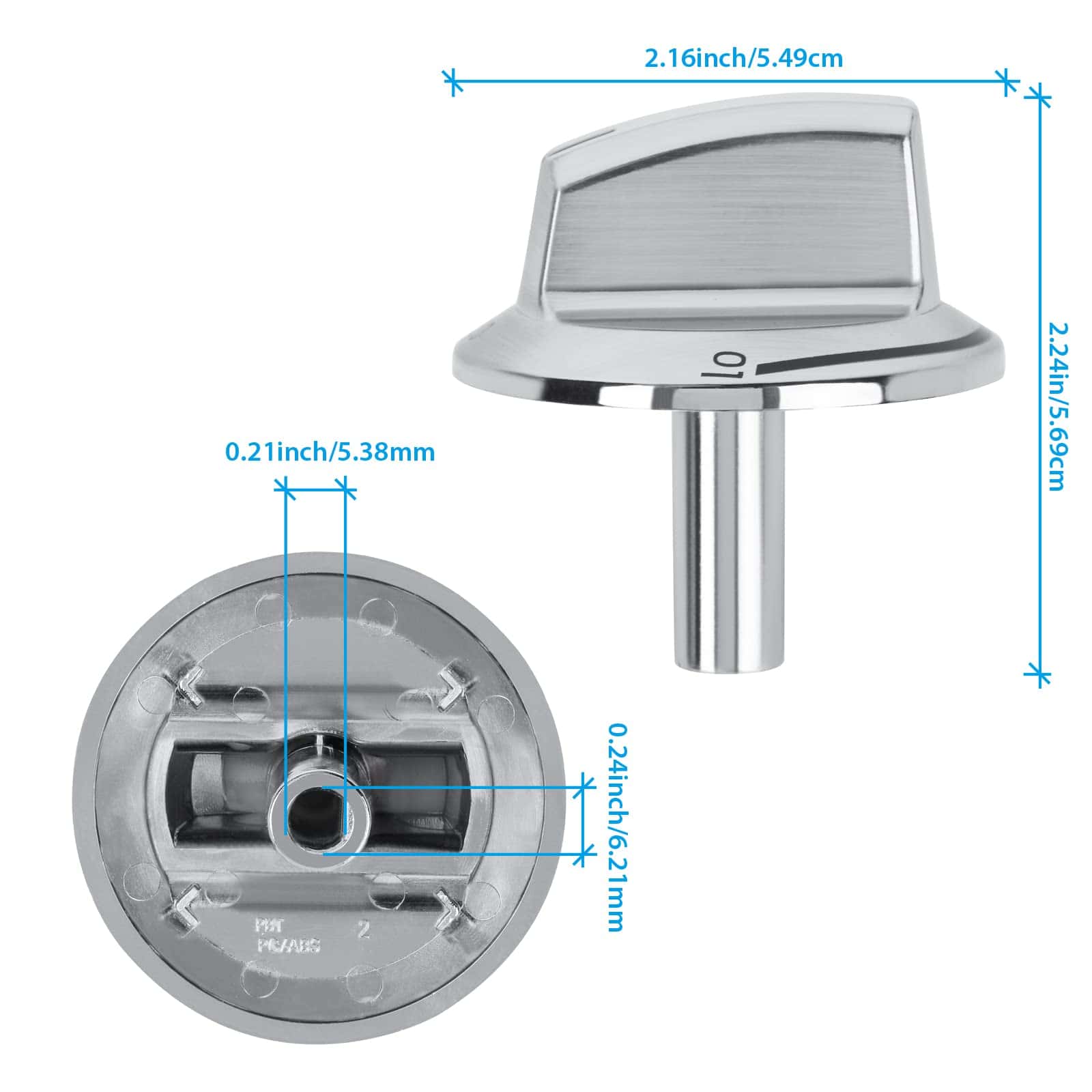1. Nota perillas de control de quemador 5304525746, el diámetro del agujero de instalación (tamaño del eje D) es de 0.24 pulgadas / 6.21 mm de longitud, 0.21 pulgadas / 5.38 mm de ancho, (consulte la imagen de tamaño) y mida el tamaño de inserción de perillas de control para asegurarse de que esta perilla se ajuste antes de comprar. Este artículo incluye 5 perillas de repuesto 5304525746, que pueden reemplazar todas sus perillas antiguas en la estufa.