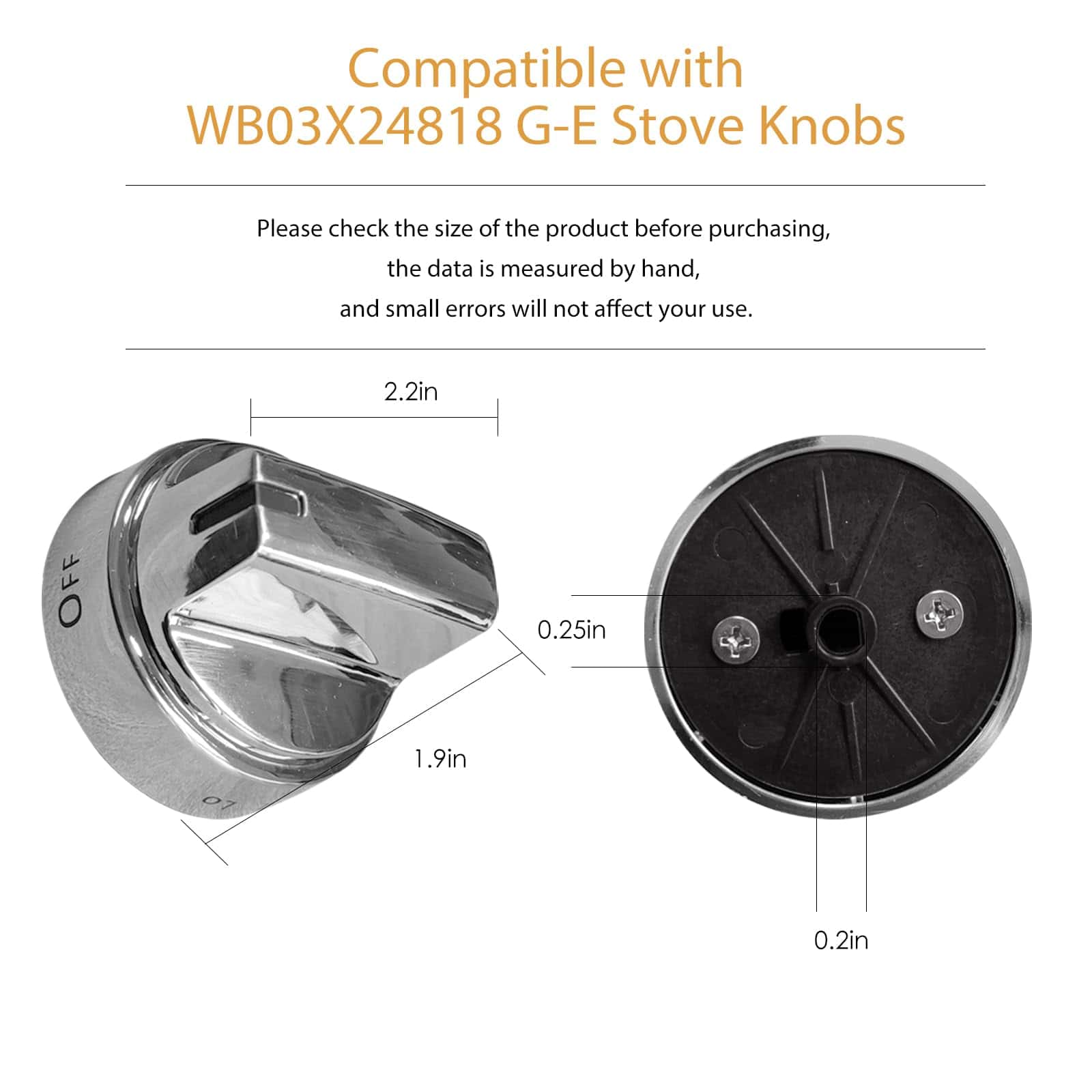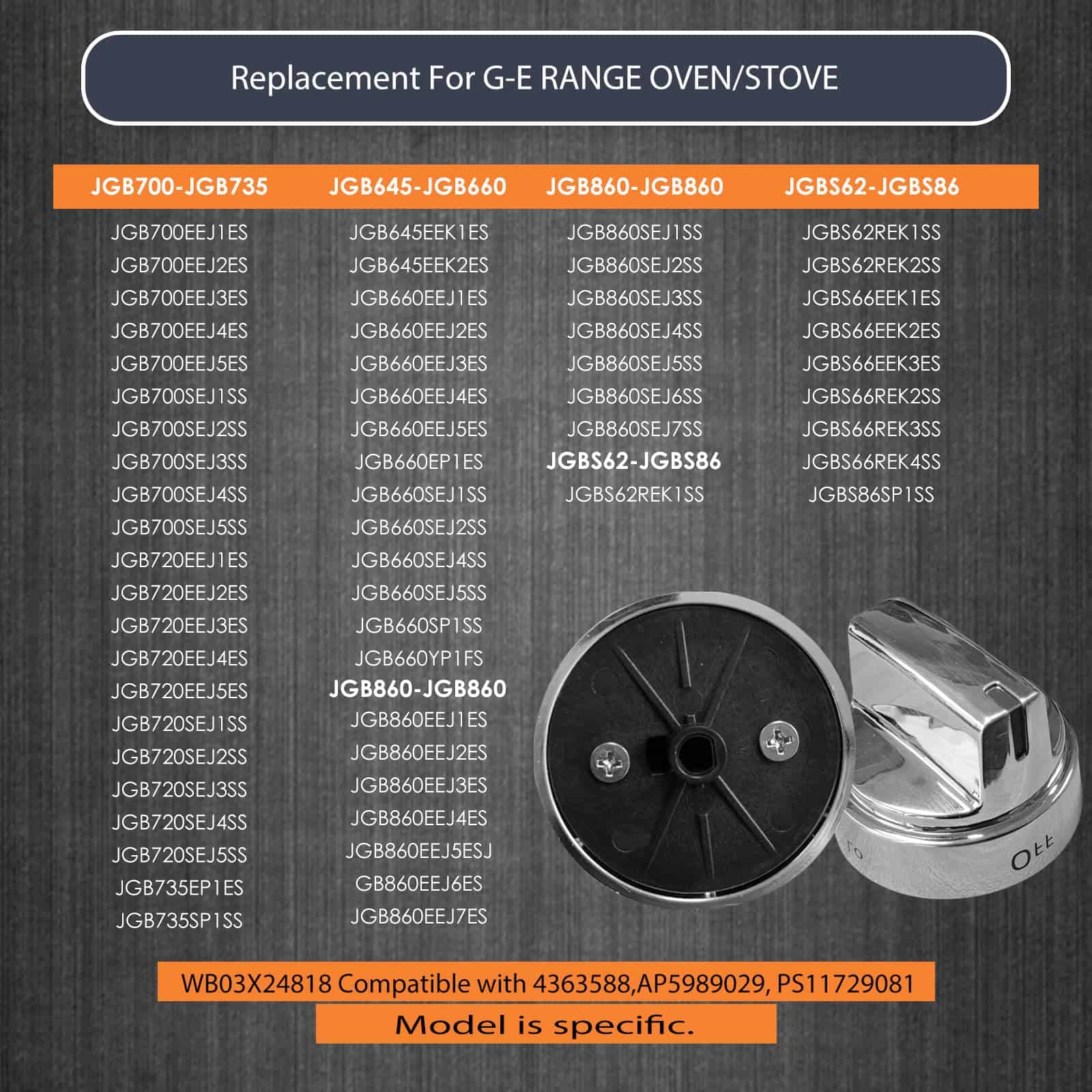 Set de 5 perillas de control de estufa de gas de plástico WB03X24818. Estas perillas son compatibles con una amplia gama de modelos de estufas GE, como JGB700SEJ4SS, JGB660SEJ1SS, JGBS62REK1SS, entre otros. Fabricadas en plástico duradero. Este paquete incluye 5 perillas de control. Producto con garantía de 1 año para una compra segura. Renueva y personaliza el estilo de tu cocina con estas perillas de control de estufa de gas de alta calidad.