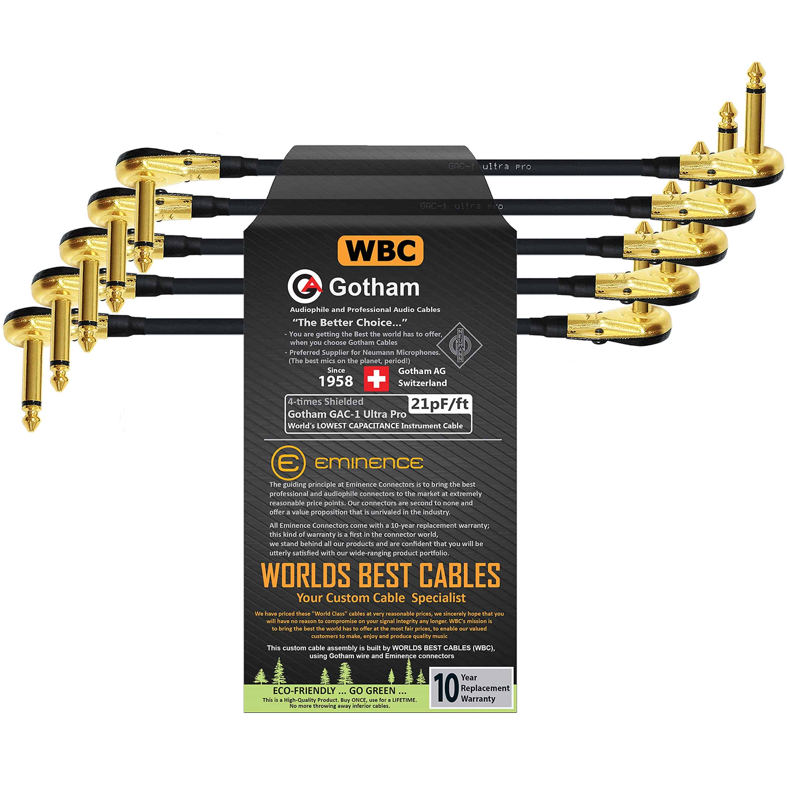 5 Unidades Hechas a Medida – Gotham GAC-1 Ultra Pro – 5 Pulgadas en forma de S, Premium, Bajo-Capacitancia (21 pf/F) Guitarra Bajo Efectos Cable de Instrumento – El Gotham GAC-1 Ultra Pro cuenta con el blindaje doble único de Reussen de Gotham (2 trenzas contrapuestas de cobre 100% de cobertura espiral) y dos capas separadas de PVC conductoras y aislación de PE celular (casi todos los cables de parche en el mercado tienen un solo blindaje y una sola capa de PVC conductora) – terminado con conectores TS Premium chapados en oro de pulgada (6.35mm) de bajo perfil y angulados a derecha tipo panqueque (este cable en forma de S también es conocido como un cable «Z»). IMPORTANTE, POR FAVOR NOTAR: La longitud del cable se mide de punta a punta de cada conector, este es el estándar de la industria para medir cables de parche (los detalles de la medición están claramente representados en una de las imágenes en la galería de imágenes para clarificar aún más el proceso de medición. Hay muchas imágenes en la galería, por favor haga clic en la imagen principal para abrir la galería completa). Por favor, también revisar las dimensiones de los conectores ya que algunos conectores pueden ser muy anchos para los jacks que están muy juntos.
